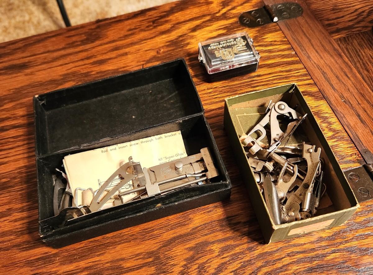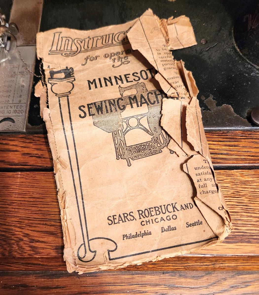 Antique Minnesota Sewing Machine - drawers - cast iron base - 1920's - treadle action is smooth. 32" tall at tallest point, 18" deep, 34.5" long. Comes with original book and accessories. Does it still sew? Seems complete, but we have no idea. Most people buy these for the base.