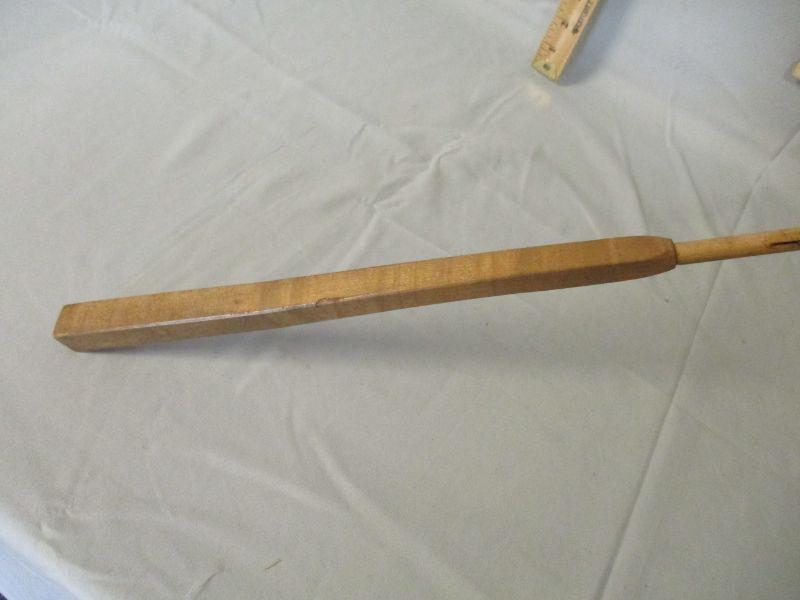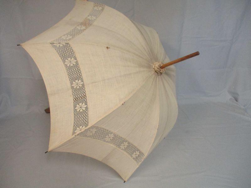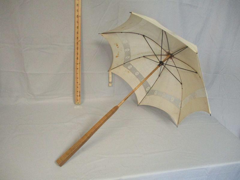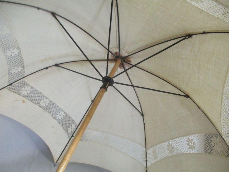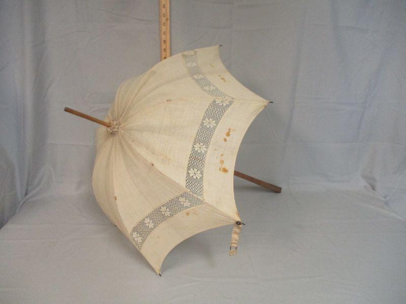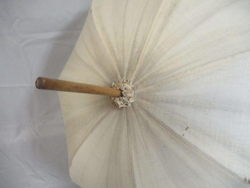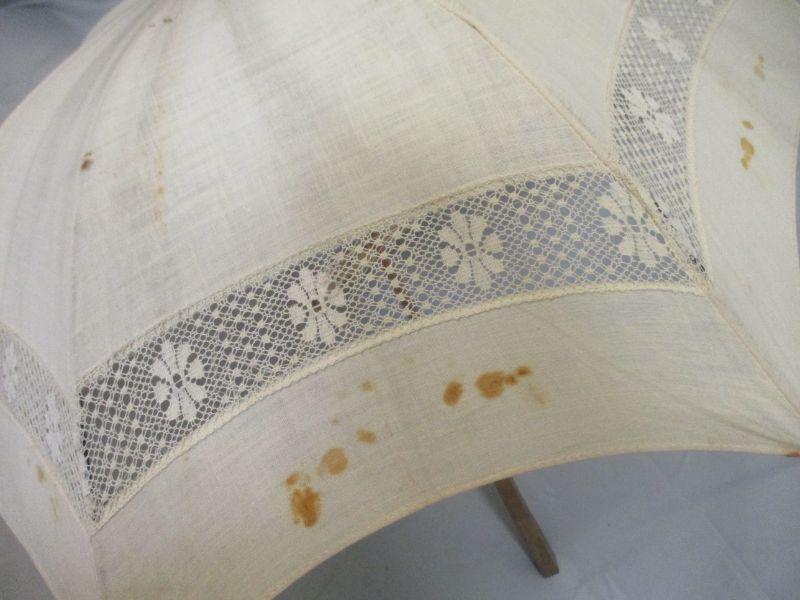 This belonged to the consignor's grandmother and is a beautiful piece of the past! It does has discoloration that I don't know if it's cleanable, but the fabric feels like a natural, untreated fabric like either cotton or linen. While there are spots of discoloration, I didn't see any damage such as tears or holes. It is on a wood stem with metal ribs. It measures about 22" in diameter and is 31.5" long. The consignor has placed a reserve on this item.