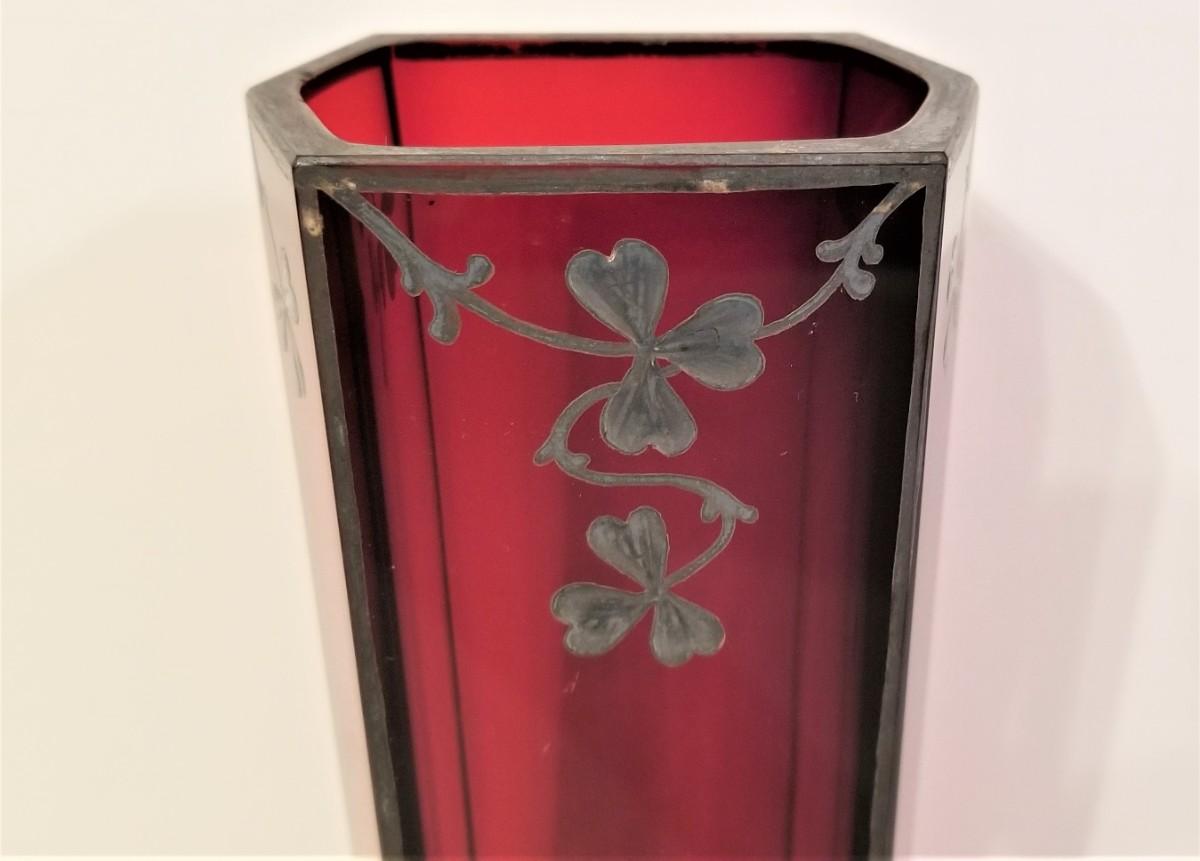 Lot #92  Antique Ruby Vase with Sterling Overlay