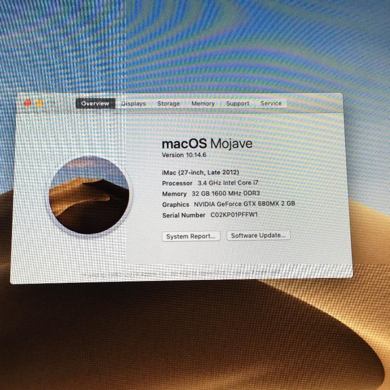 Apple IMac 27”. Lot includes late 2012 27” IMac with a 3.4 GHz Intel core I7, 32GB of 1600 MHz DDR3 memory Nvidia GeForce GTX 680MX 2 GB and a 3.12 TB drive. Model A1419 100-240V. Don’t miss out on this high end beauty with all the bells and whistles. Computer worked when tested. Computer does not have stand