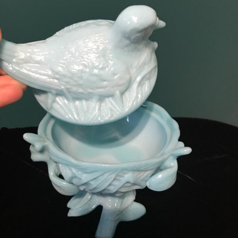Blue milk glass bird is a covered candy dish. See photos for manufacturers mark. No visible cracks or breaks. Cute addition to your kitchen and tableware or great gift. Shipping available.
