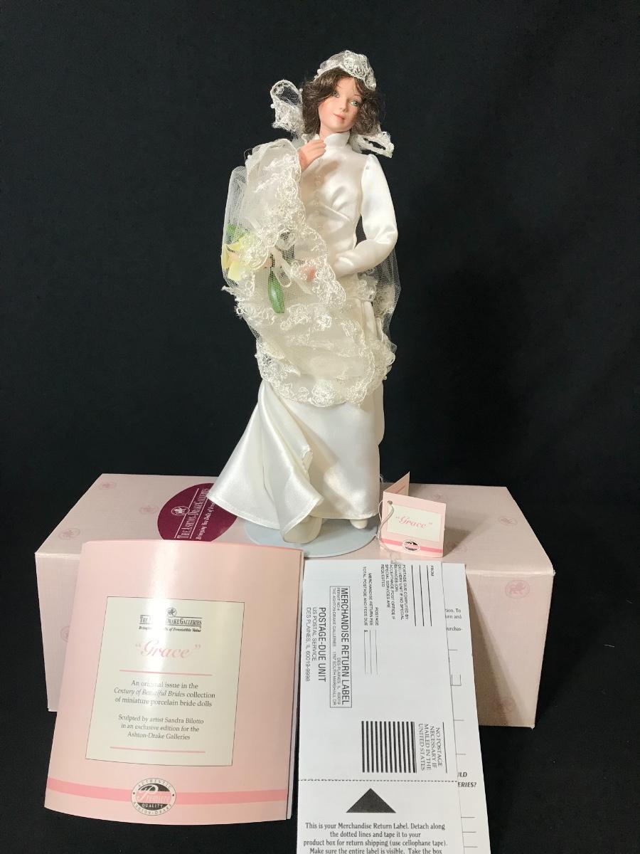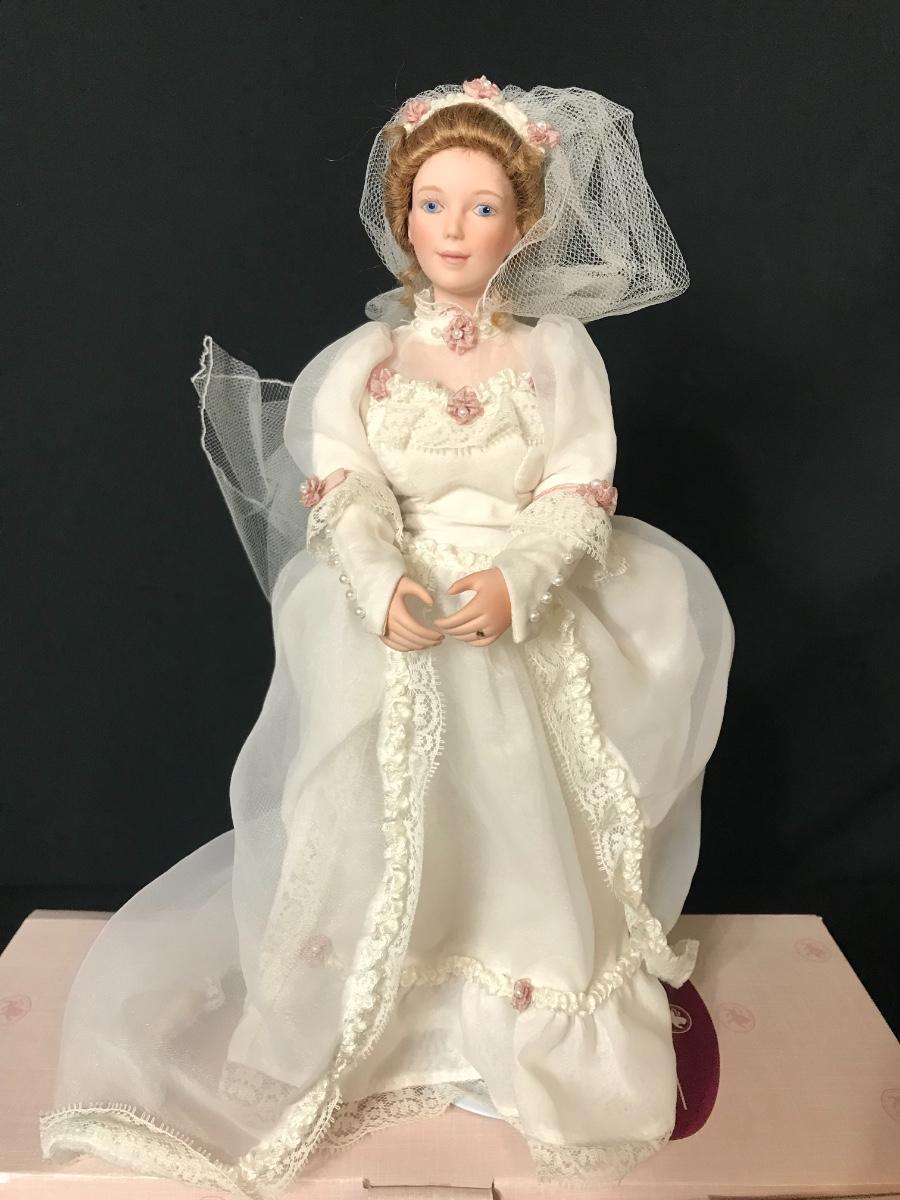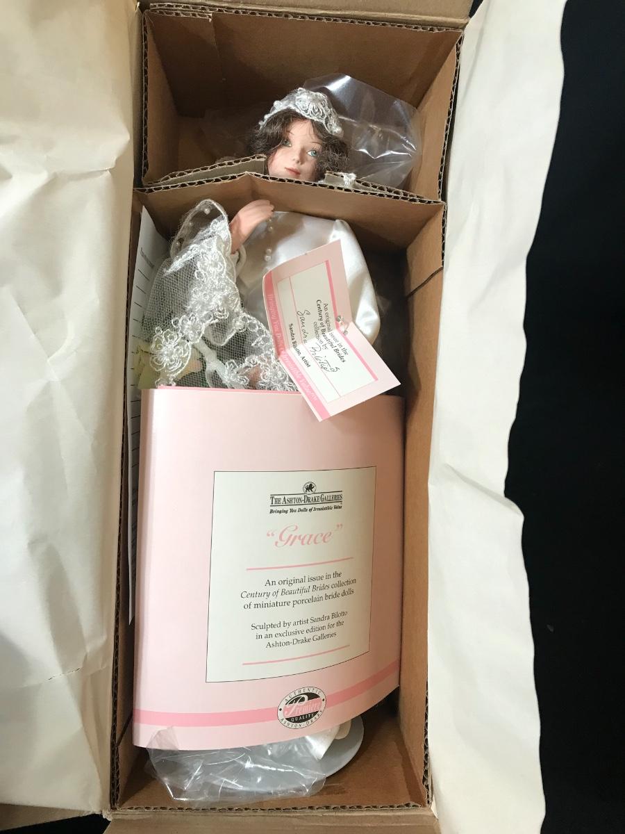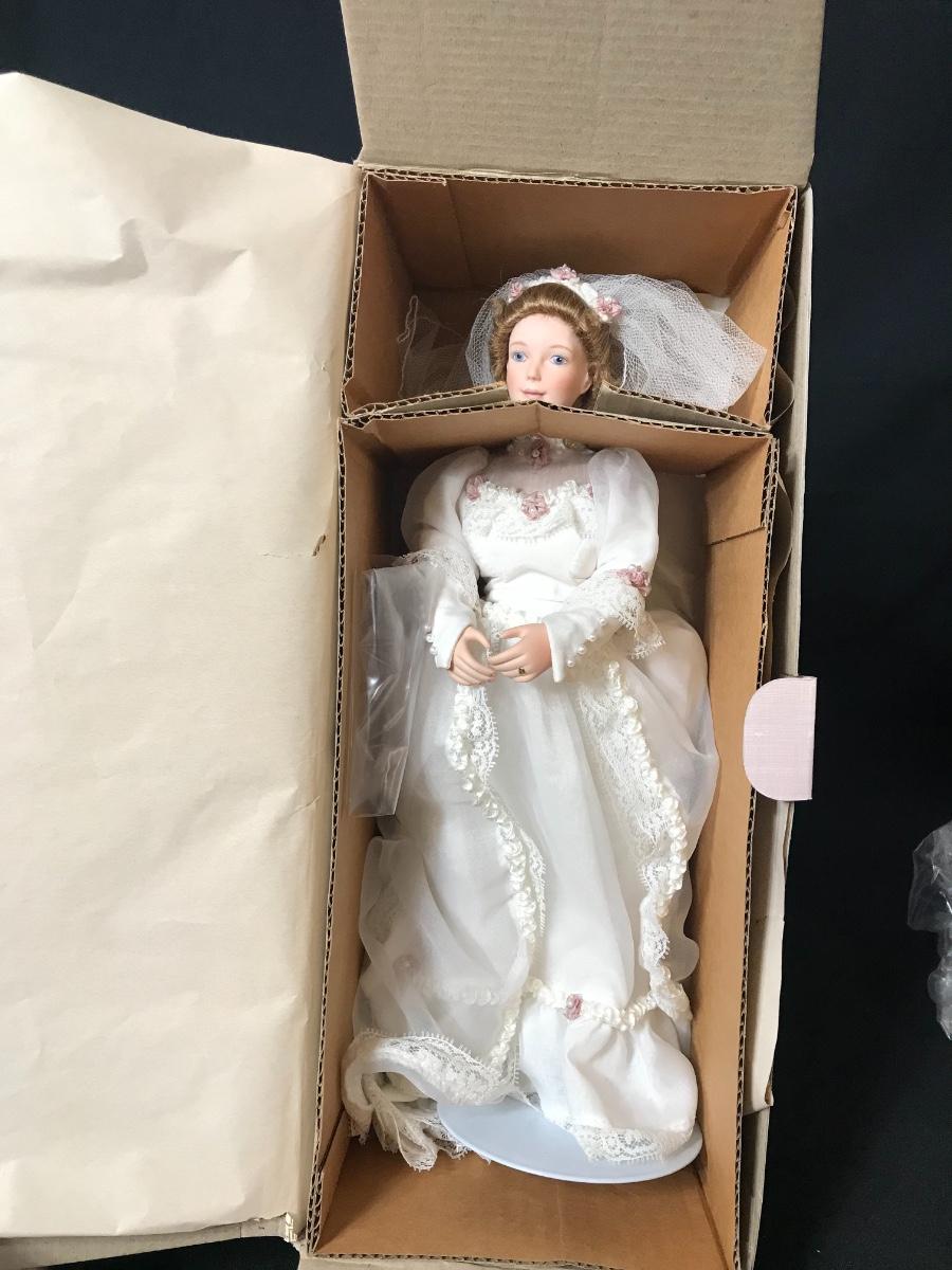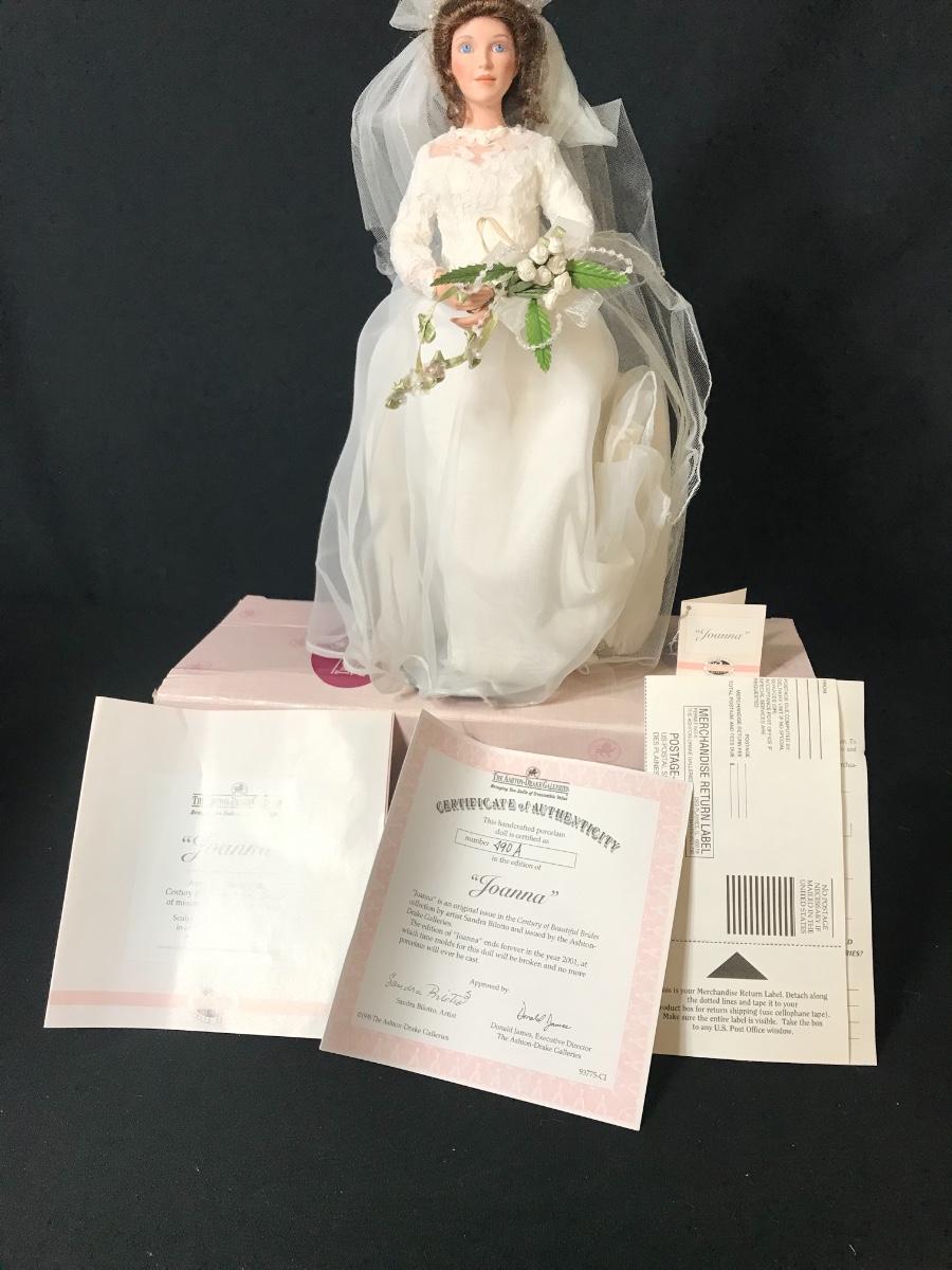 Collection of Ashton-Drake Galleries Bride Dolls - Grace, Katherine, Joanna, Donna & Heather. Please see all pictures as they are the best representation of the items. The pictures show condition, measurements if taken, and what is included in the lot. Due to the large amount that we photograph and the time frame, we are not always able to take measurements. All items unless noted, are pre-owned and have been used. Please bring packing materials for your items. If you purchased furniture, you must bring help. We do not allow one person to carry large furniture out on their own. Bring help, tools and a truck for your personal safety. Company policy. Thank you.