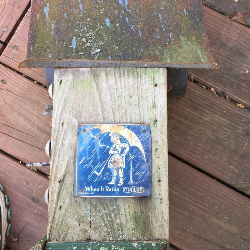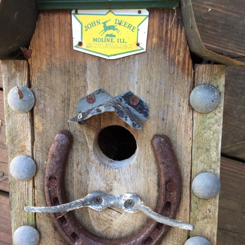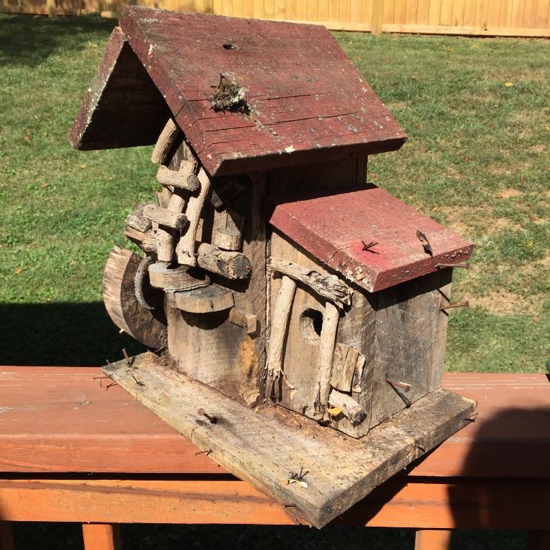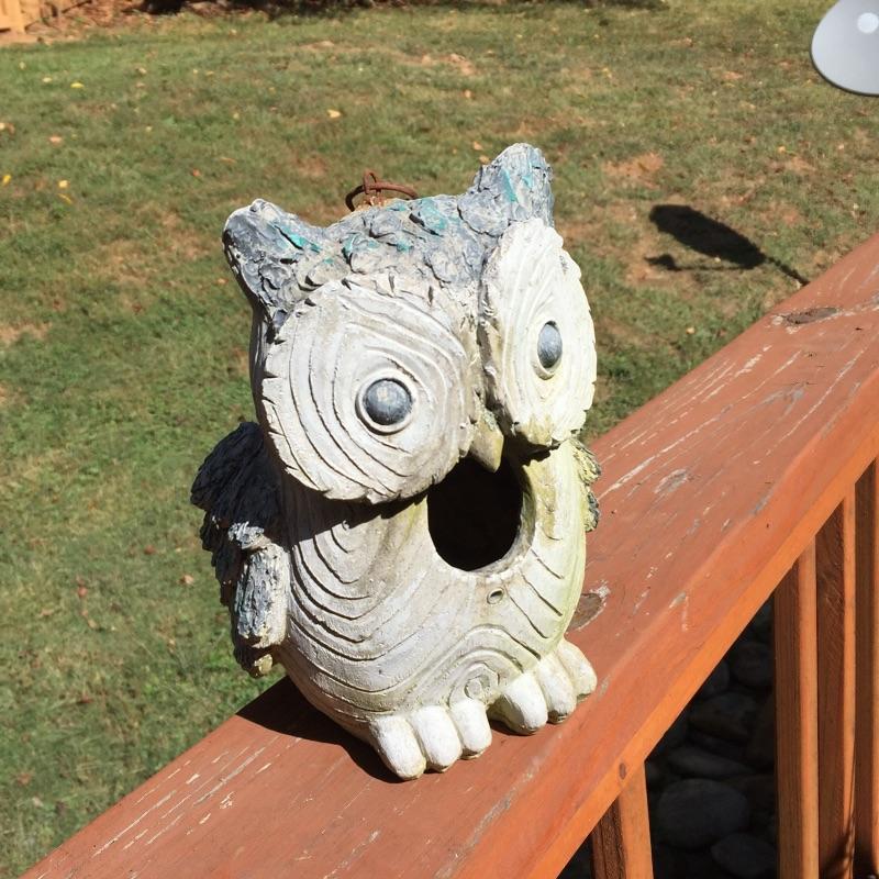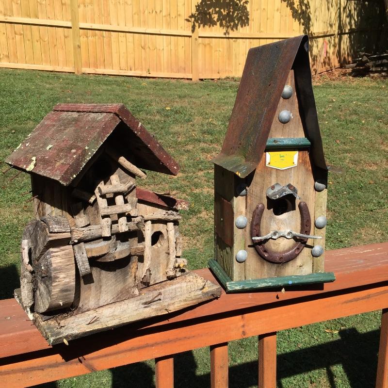 Fill your yard with this charming collection of birdhouses. A lovely assortment of wood and metal houses and a plaster cast owl bird house as well. 7 houses in total, the largest measures 18” tall. This largest house is truly special, signed by its maker Keith Emory, it features a rustic metal roof and metal signs attached to front and side. The other larger house has two bird holes and features lots of details throughout.