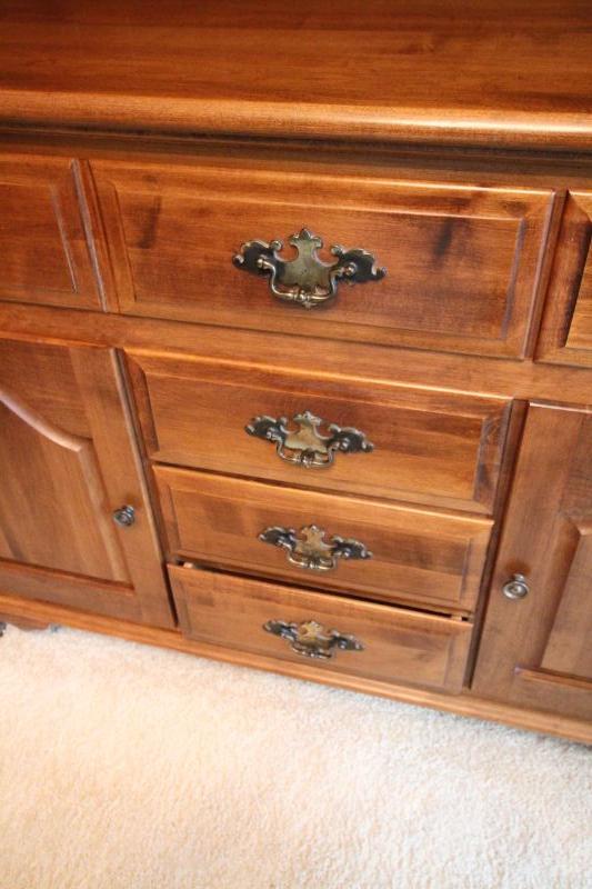 48w x 19d x 74h dimensions. Maple finish. 5 drawers with built in silver storage drawer. Magnetic latch doors. No scratches. Not lit. One solid piece. Solid wood. No manufacturer mark. Plywood back. Brass batwing hardware.