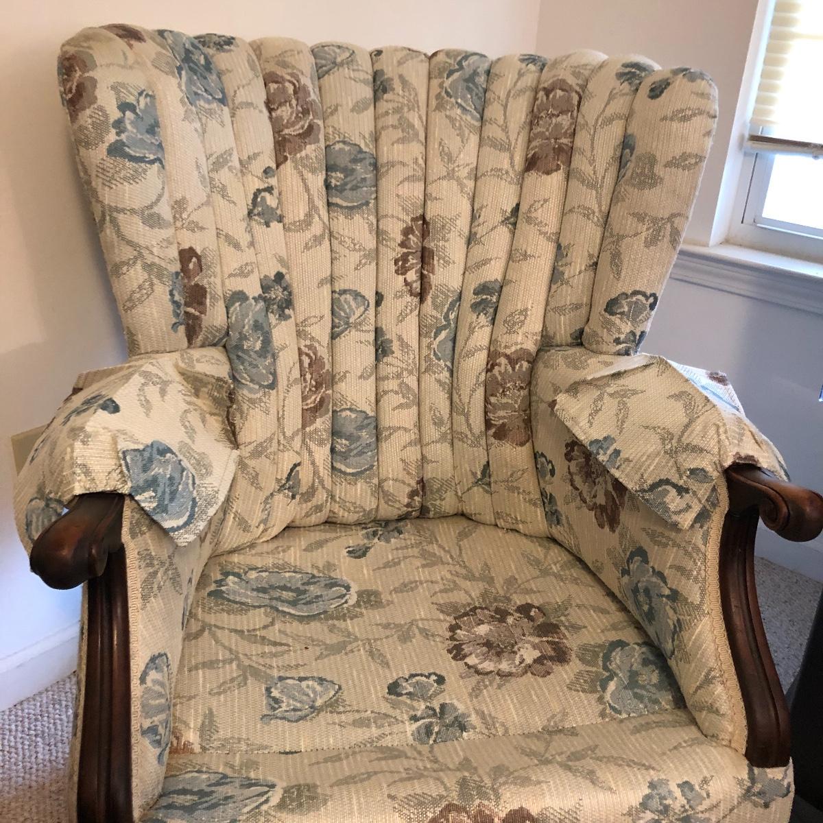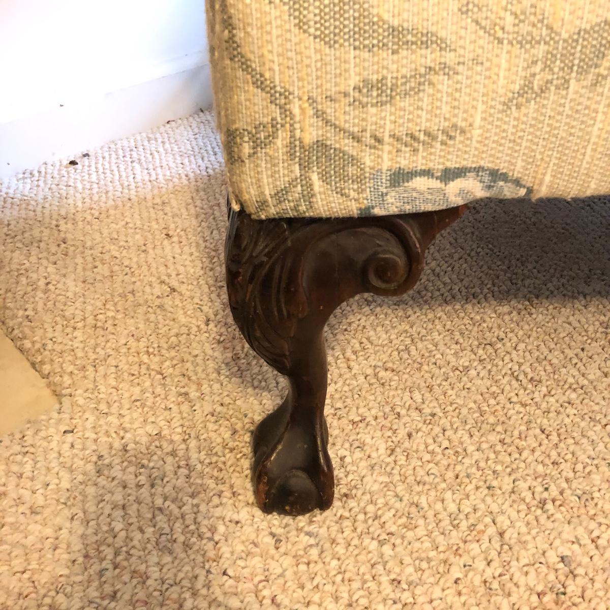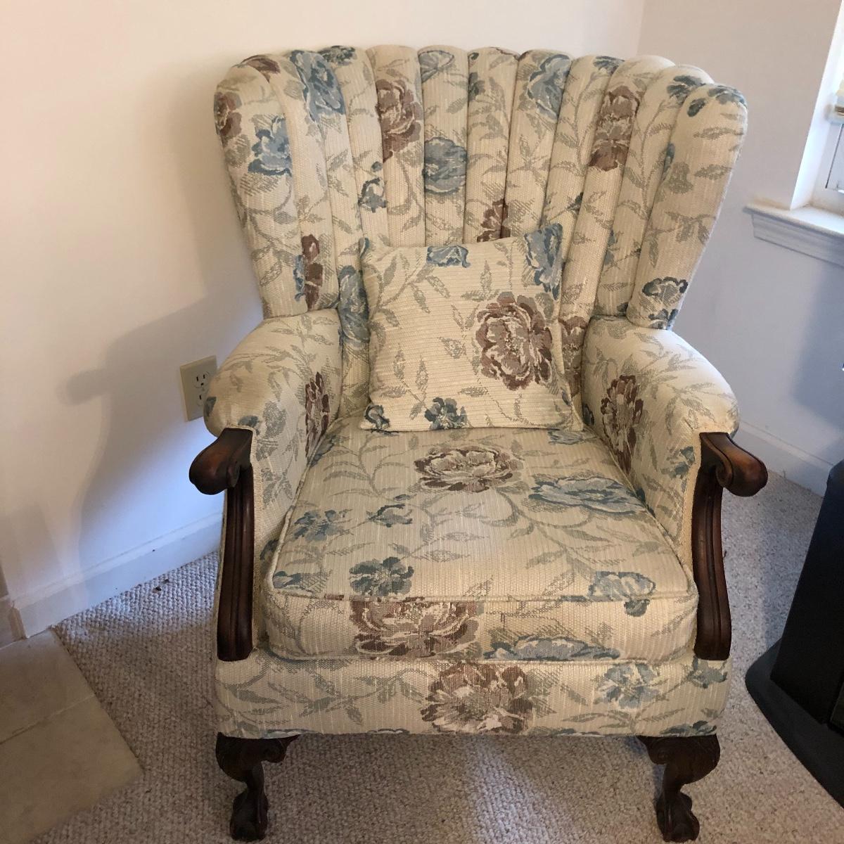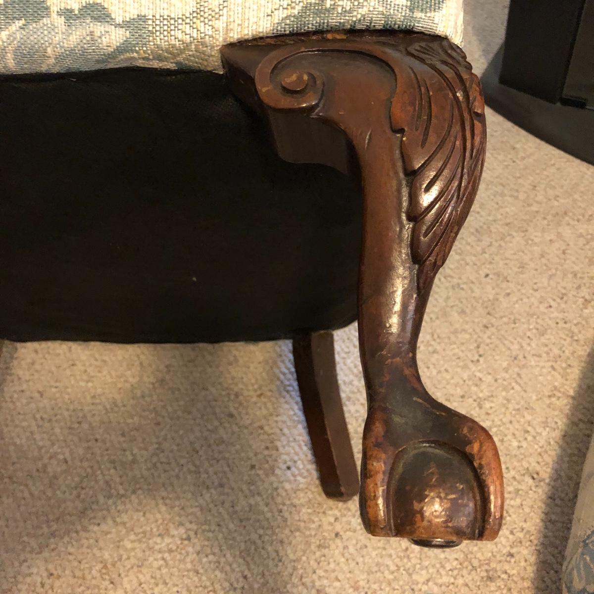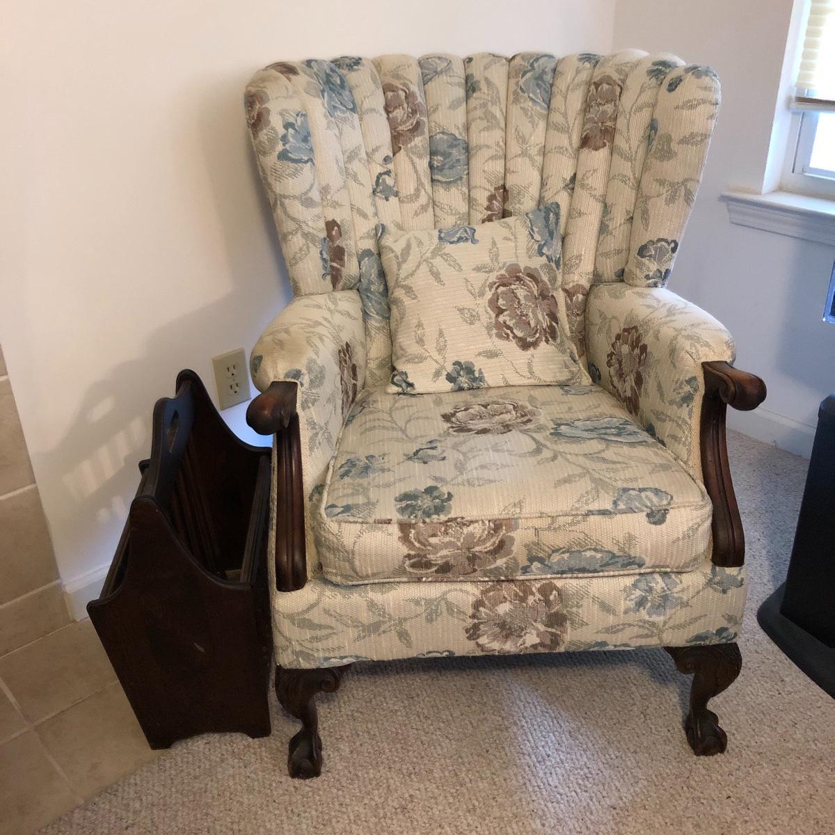 Sit back and enjoy a nice magazine in your claw footed chair. Chair has wooden front claw feet and comes with arm covers. Also includes wooden magazine rack. Chair measures 29.5” x 34” x 35” with a 18” seat height.
