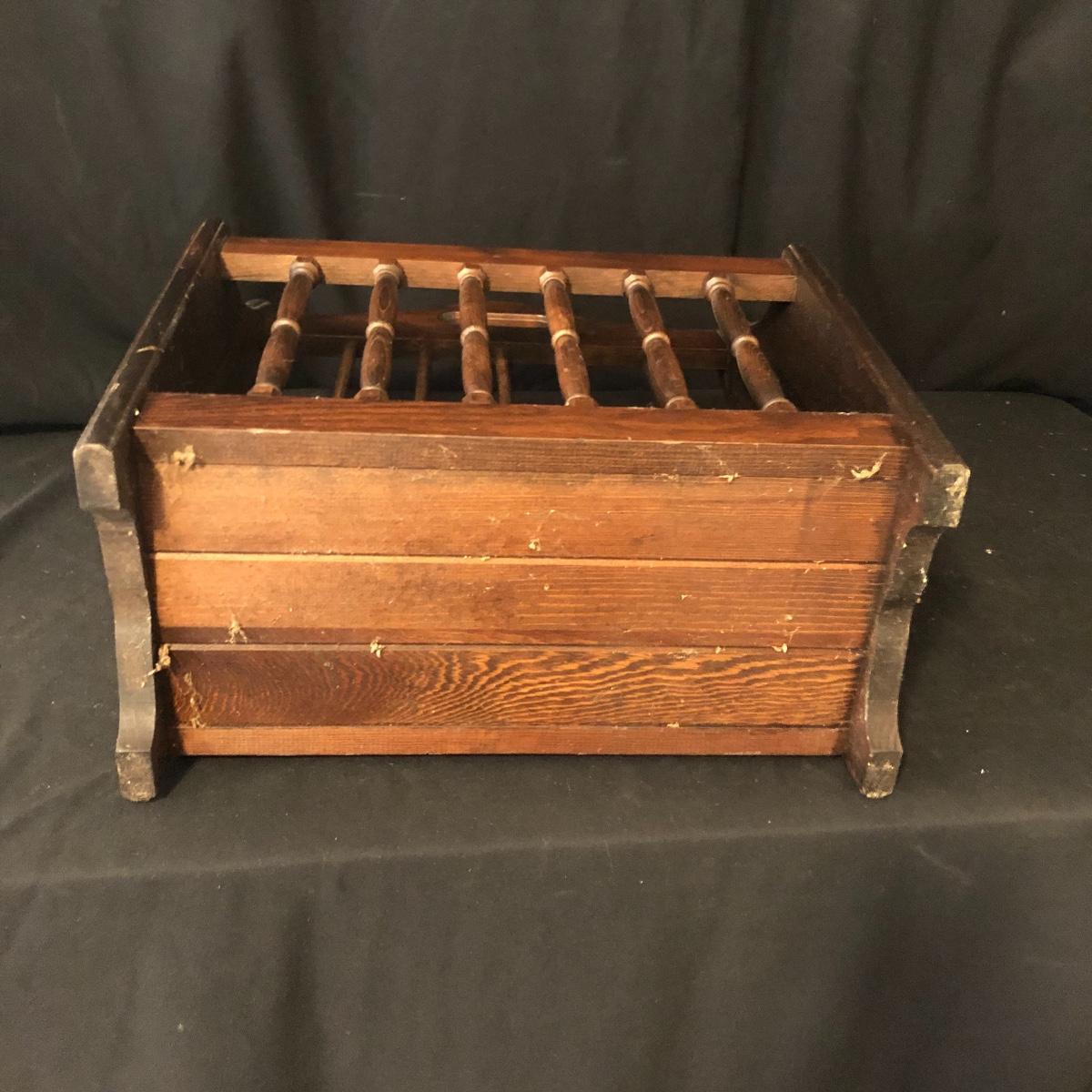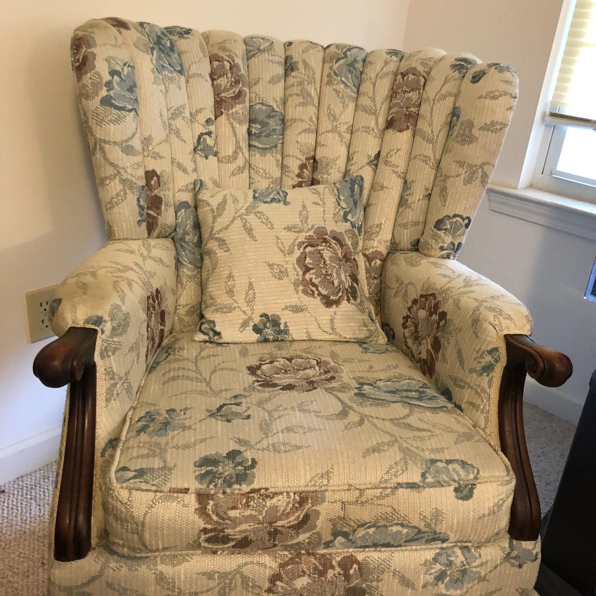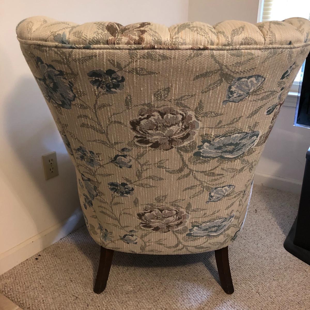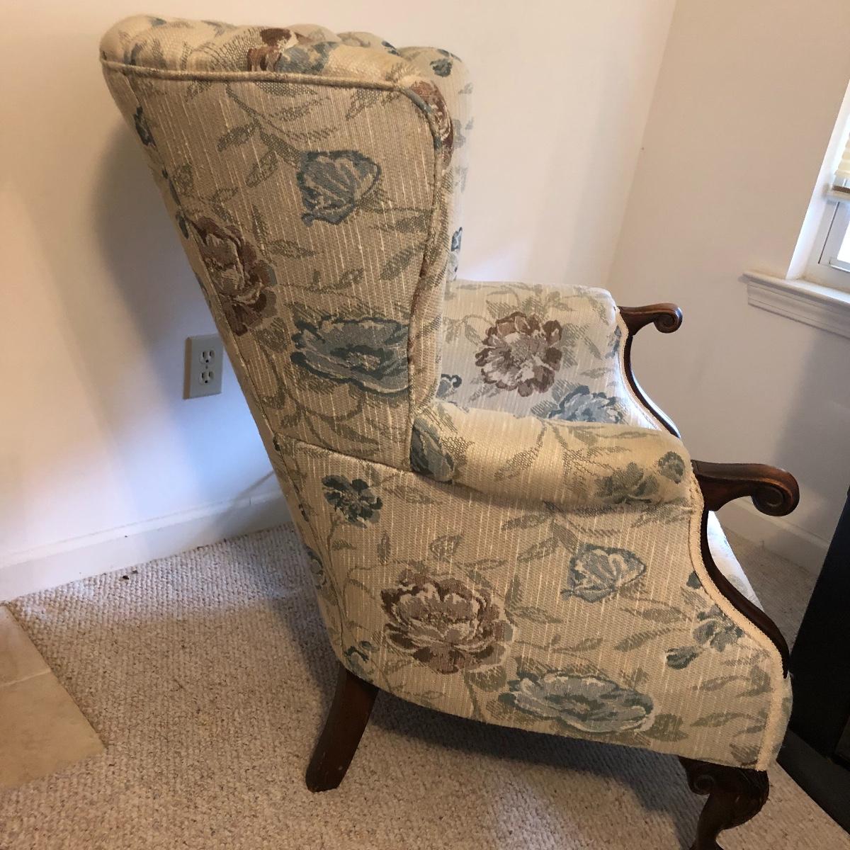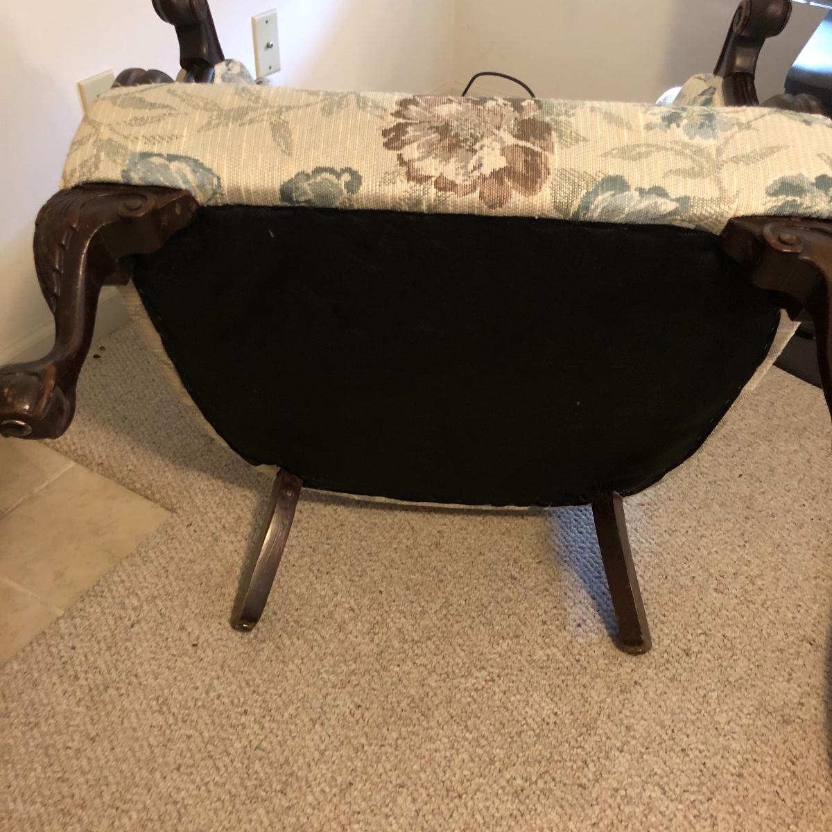 Sit back and enjoy a nice magazine in your claw footed chair. Chair has wooden front claw feet and comes with arm covers. Also includes wooden magazine rack. Chair measures 29.5” x 34” x 35” with a 18” seat height.