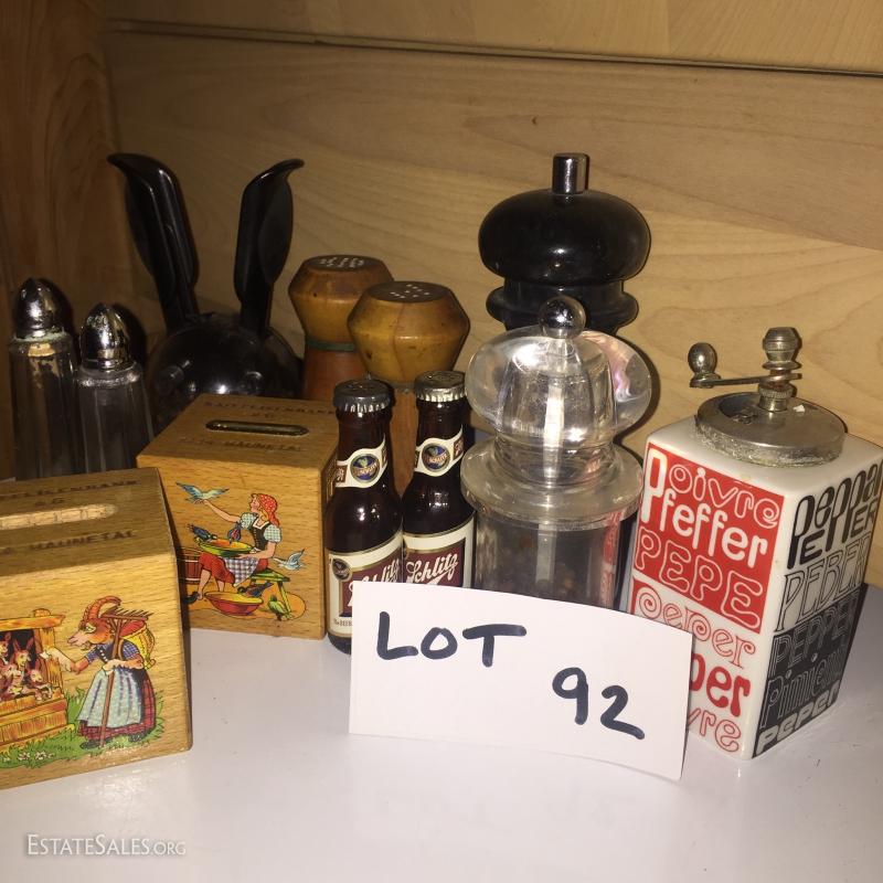 Lot 92 - Collection of salt and pepper shakers, grinders and two mini banks