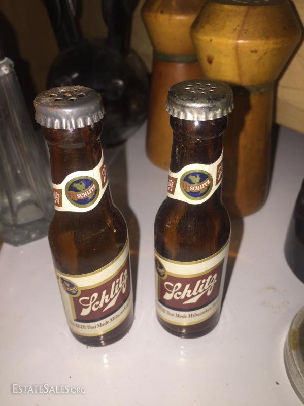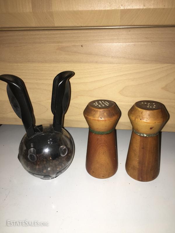 Collection of salt and pepper shakers and grinders and two mini wooden coin banks with out the plugs.