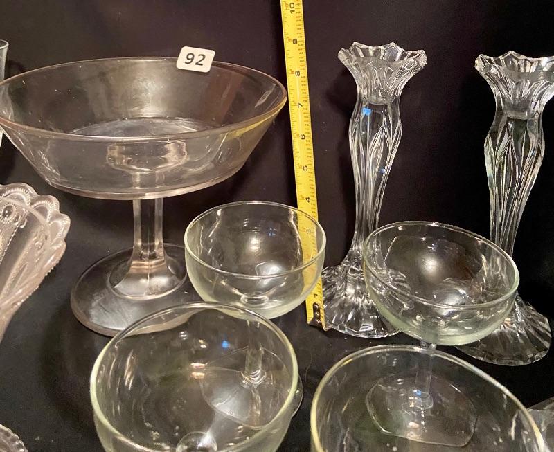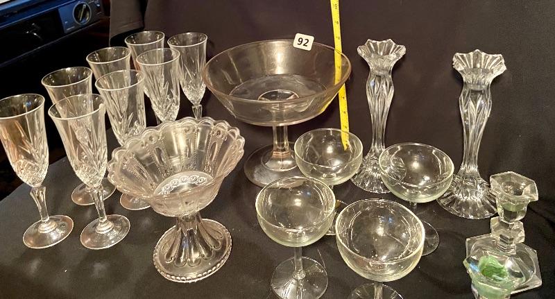 Lot 92; Crystal flutes, wine glasses, candy dishes, and candle sticks.
