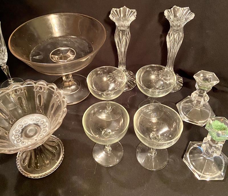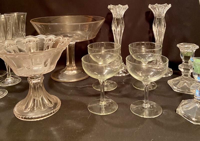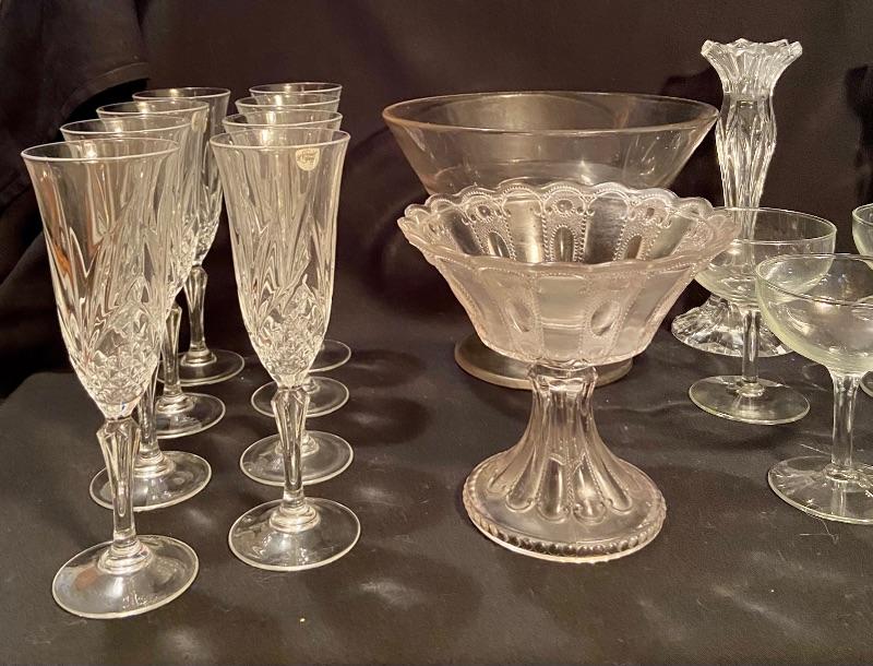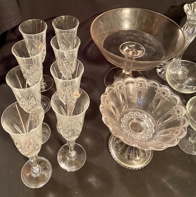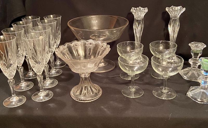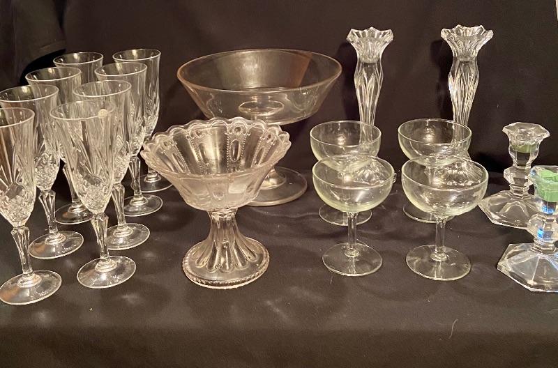 Crystal flutes, wine glasses, candy dishes, and candle sticks. MHW
