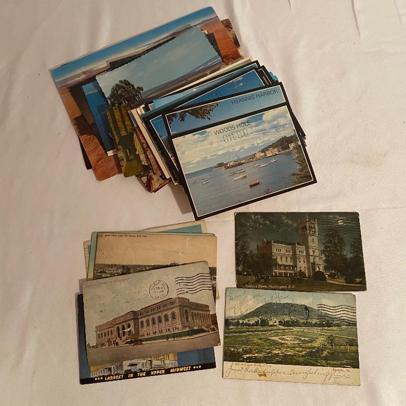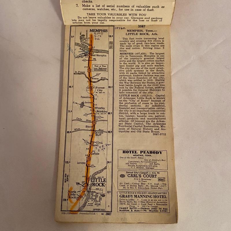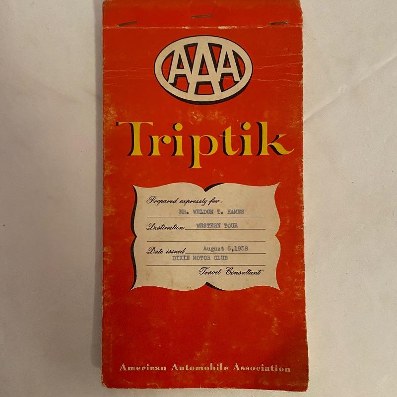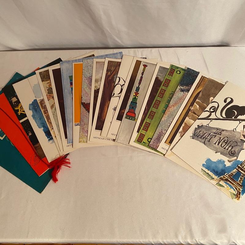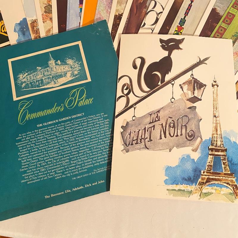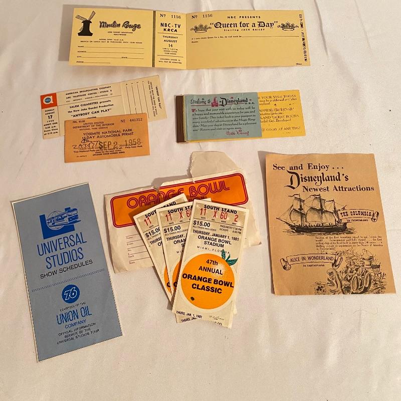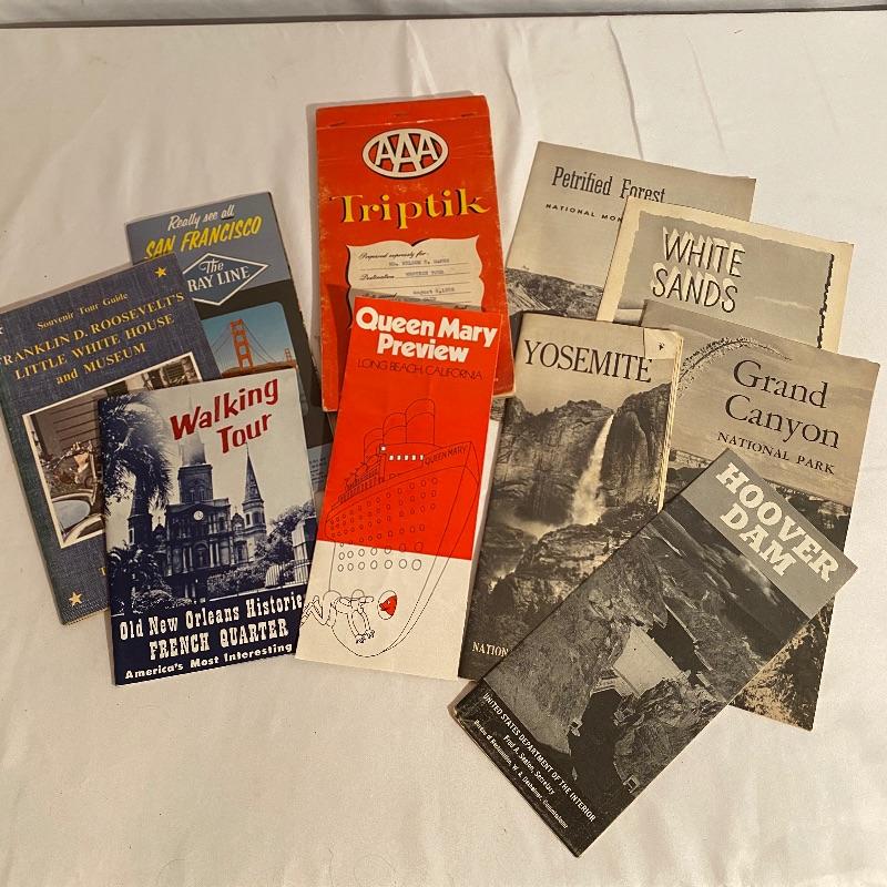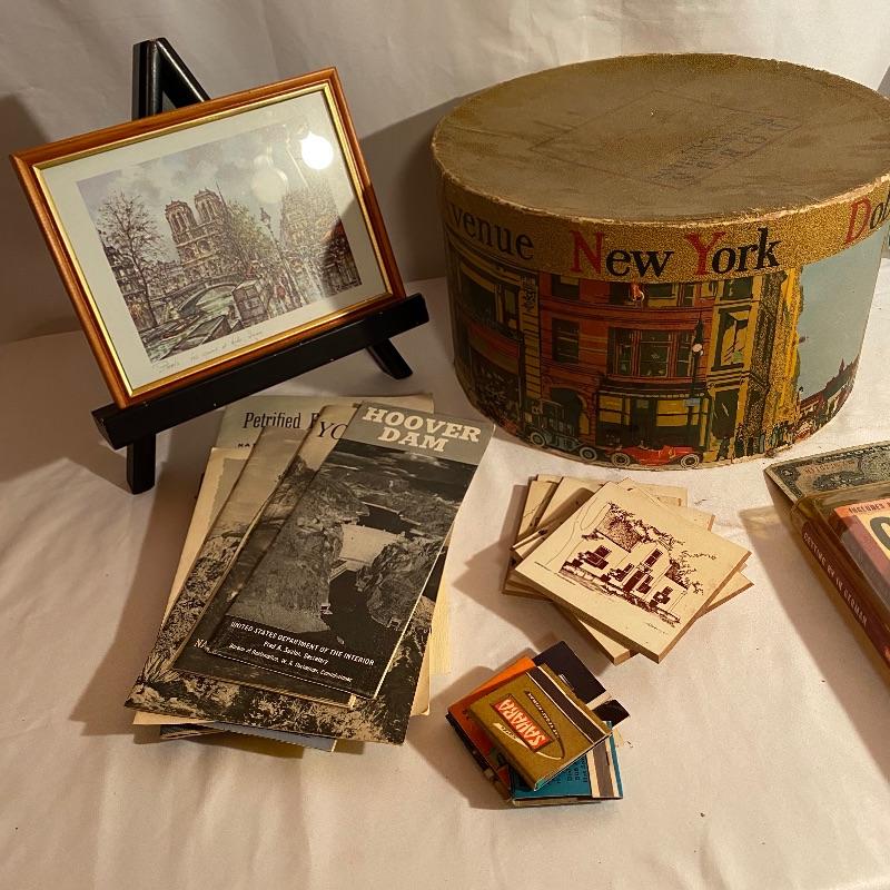 This lot will make you yearn to go somewhere! First there is an adorable hat box from Dobbs 5th Avenue store which has New York City skyline all the way around the edges. Then you’ll find a cute framed print of Norte Dame in Paris that measures approx 9” x 6.5”. Lot also includes a stack of menus from restaurants in the US as well as from Sitmar Cruise ship’s themed lunches, vintage postcards, and AAA Triptik itinerary for a western tour of the US with 1950’s park brochures. You’ll also get cassettes to teach you German, vintage matchbooks, a coaster set, walking tour brochures and old tickets to the Orange Bowl, Disneyland and TV Studio Tours! What a fun lot! Shipping available.