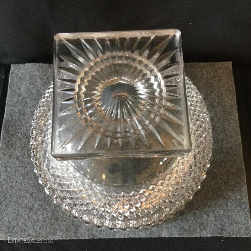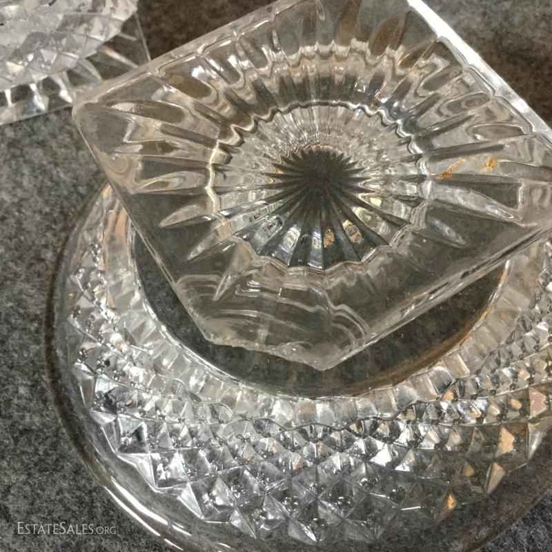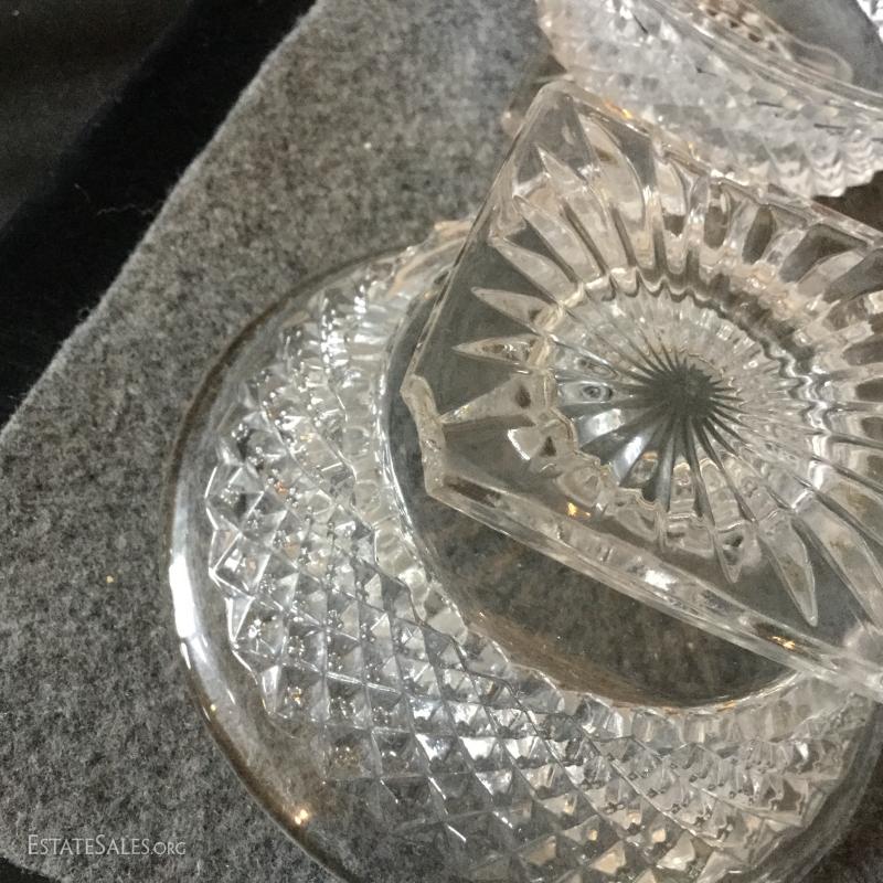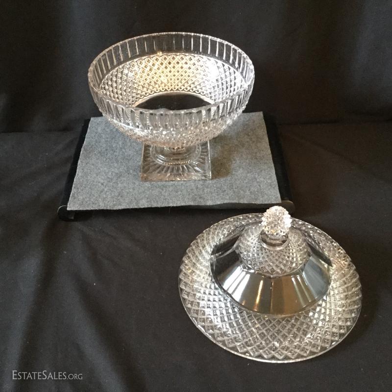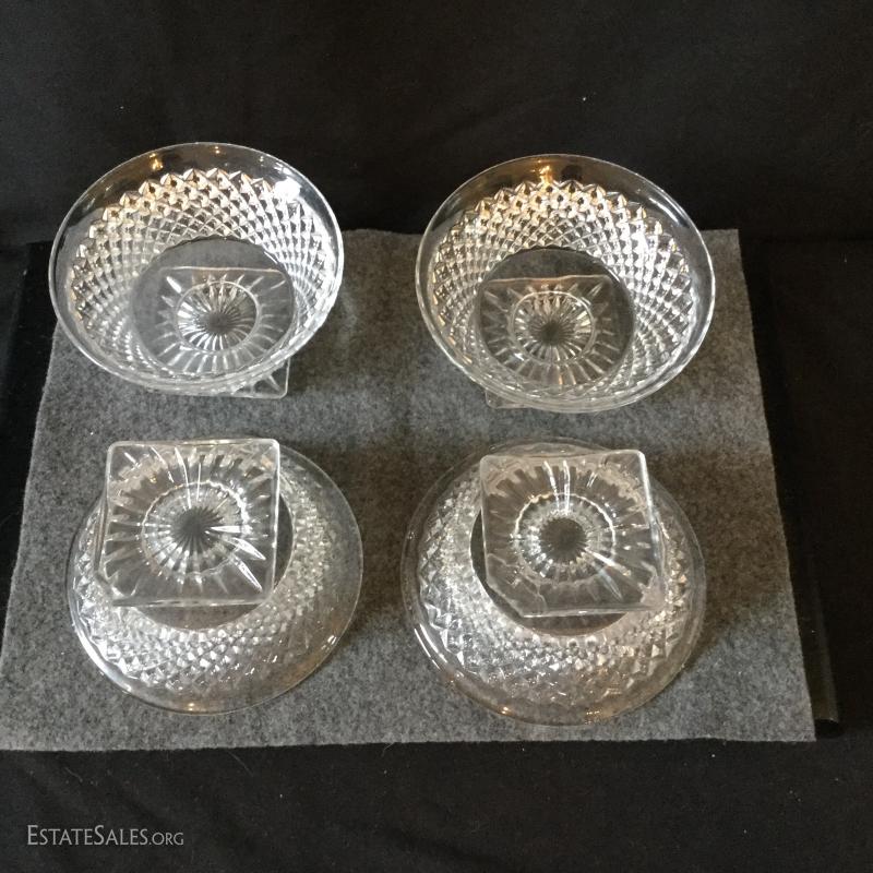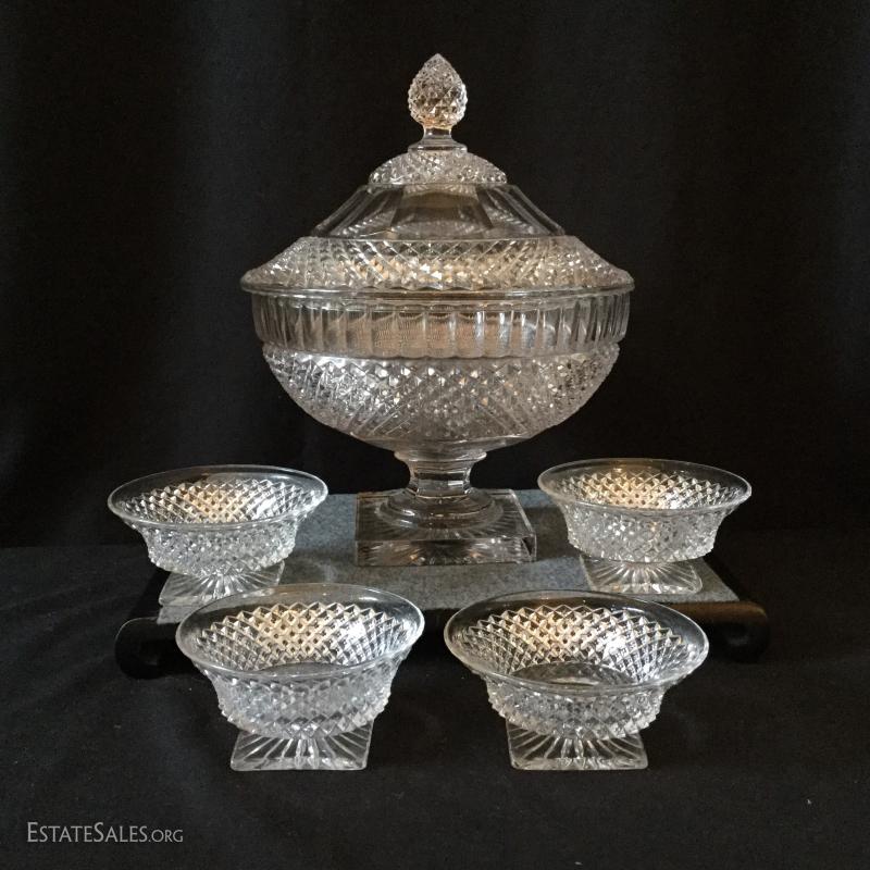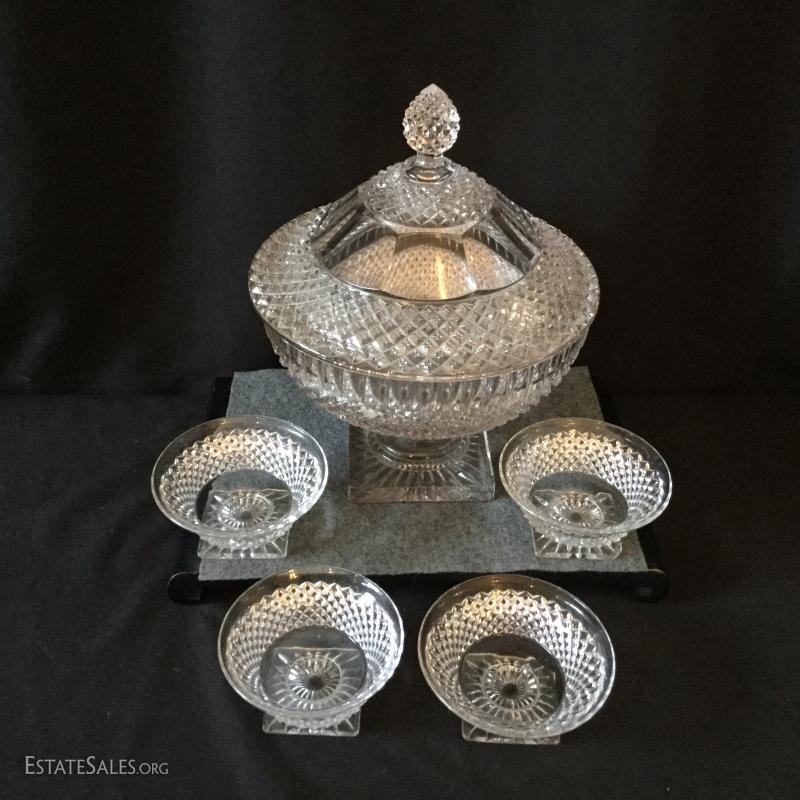 For your next dinner party serve dessert in this festive crystal covered dish and lid with four matching dessert bowls. Two of the bowls have one chipped corner on the bottom.