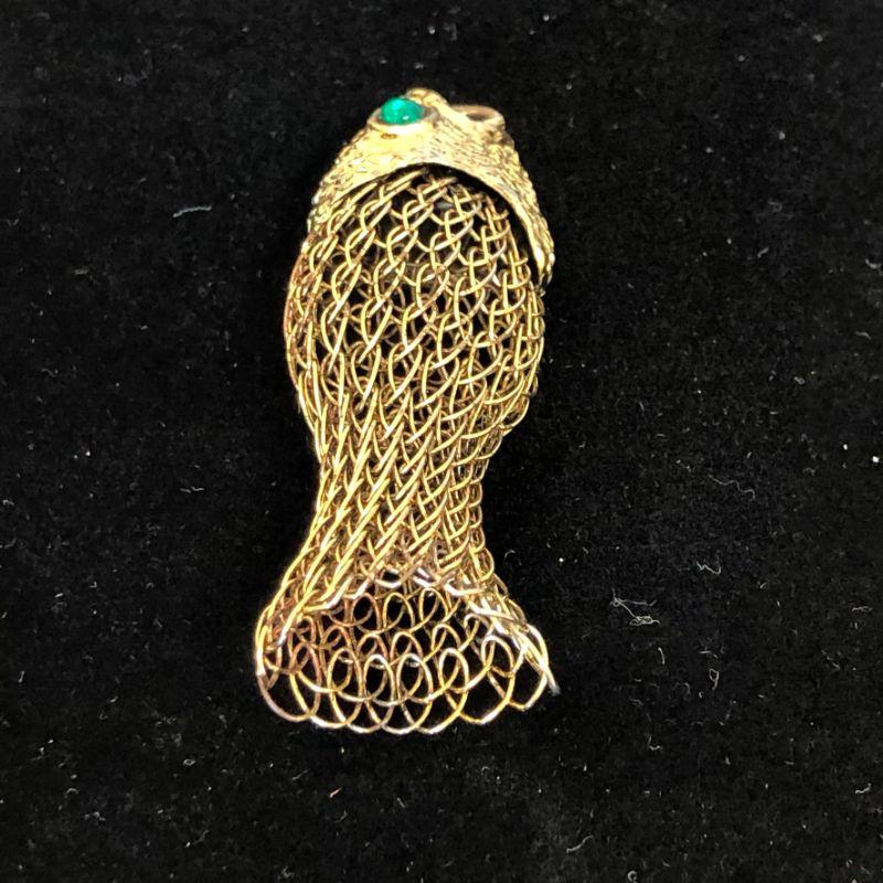 I think that this pendant is pretty cool because the mesh allows it to move. It has a green colored eye on either side and is 3" in length.