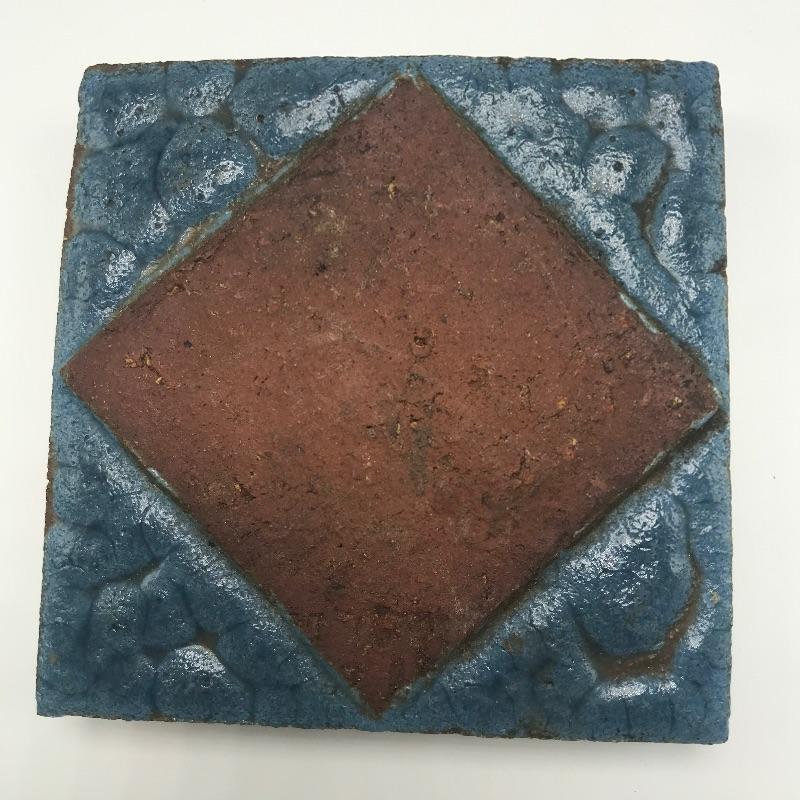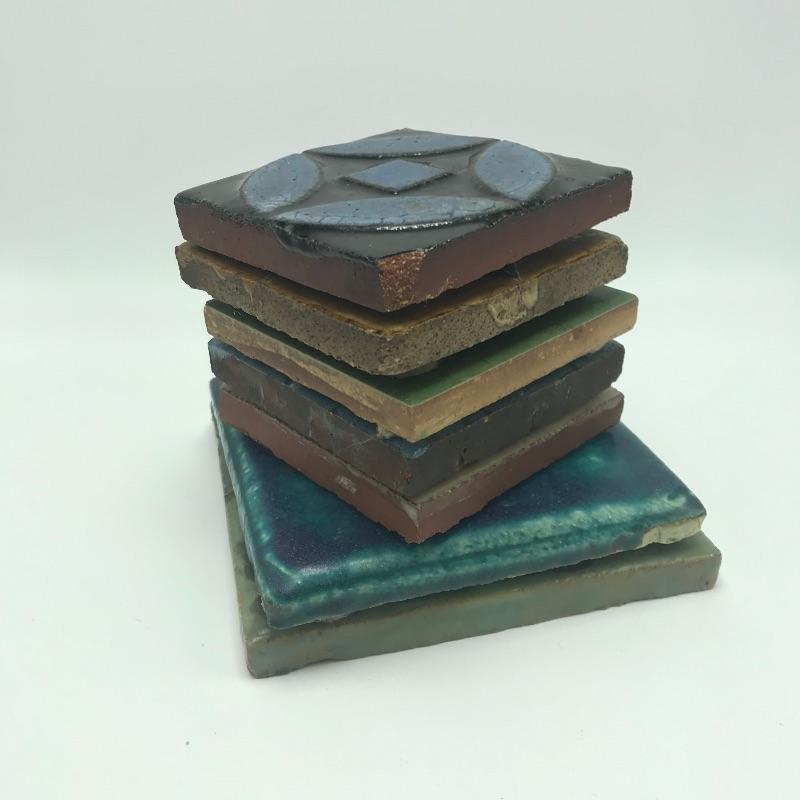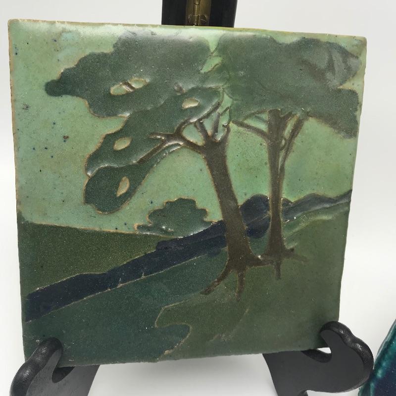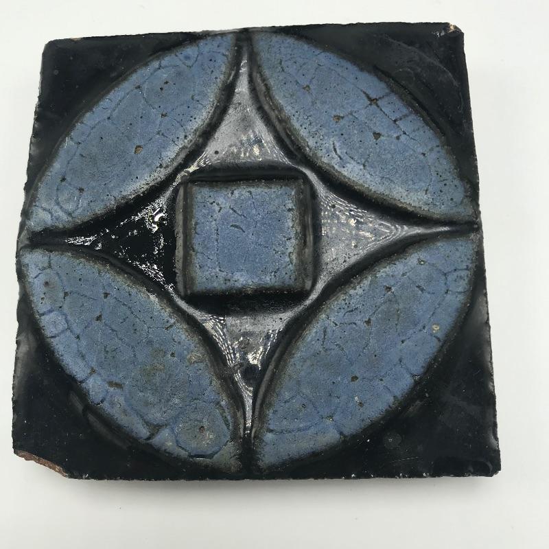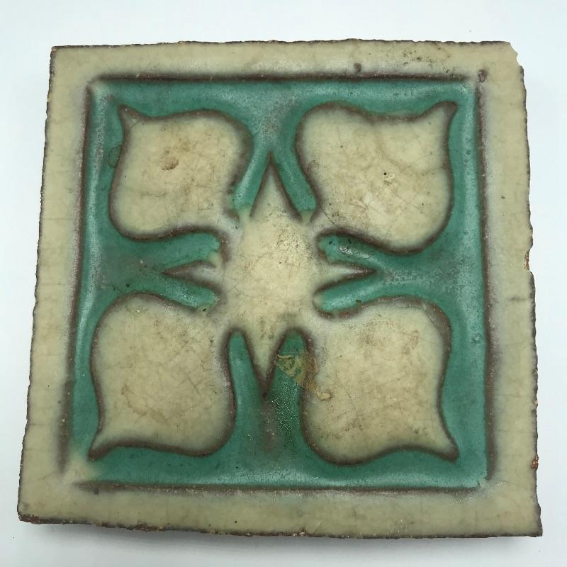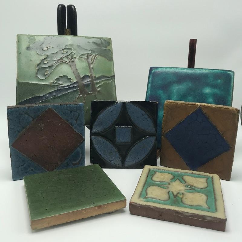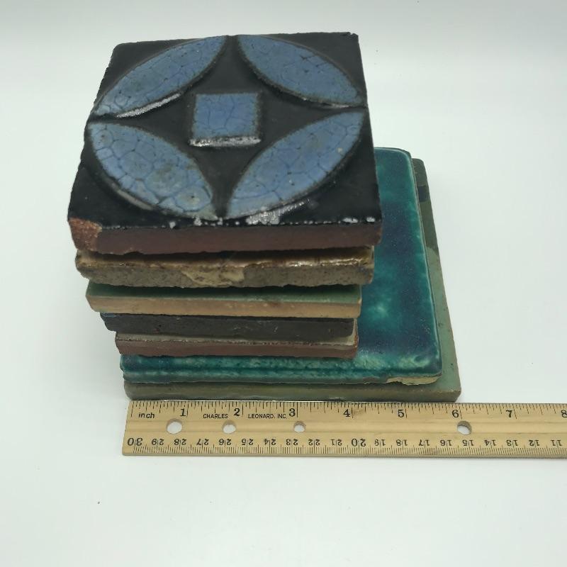 Bold, intricate, simple and broad would be some great adjectives to describe these Arts & Crafts tiles. Collection features seven 4”-6” square tiles with various markings including two Grueby tiles. Most tiles have markings and some have bottom padding. See photos.
