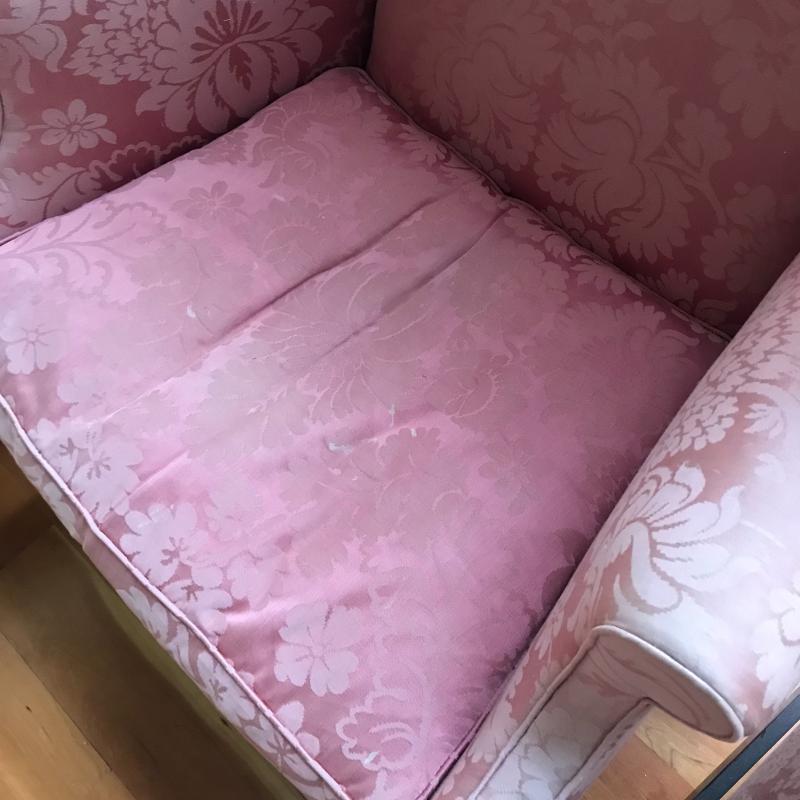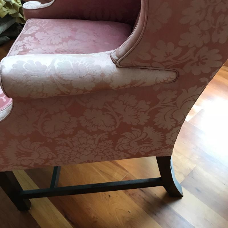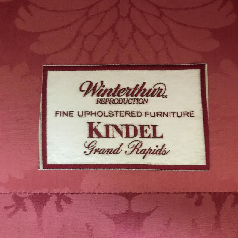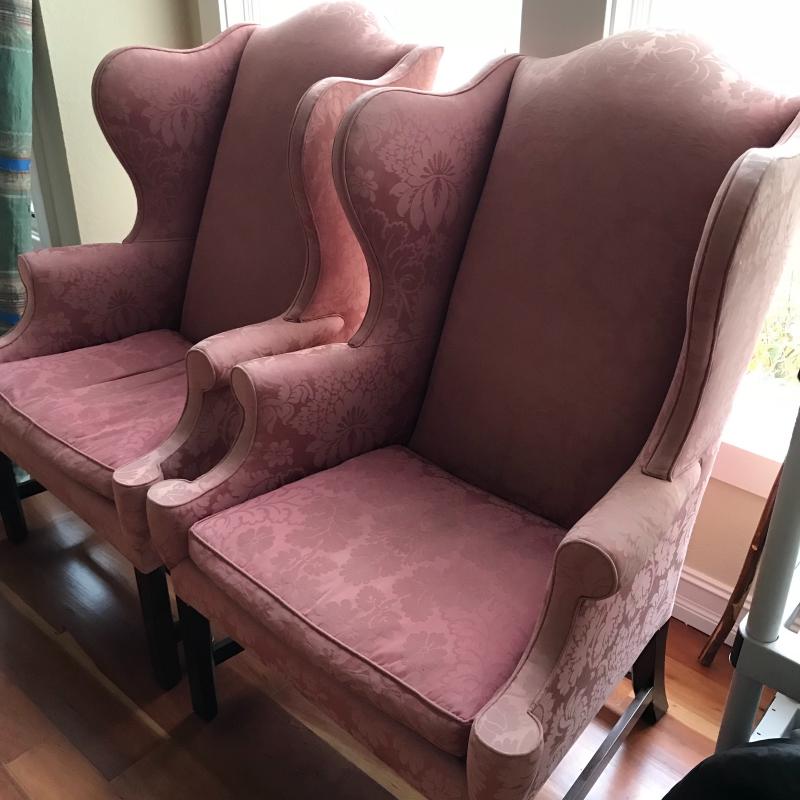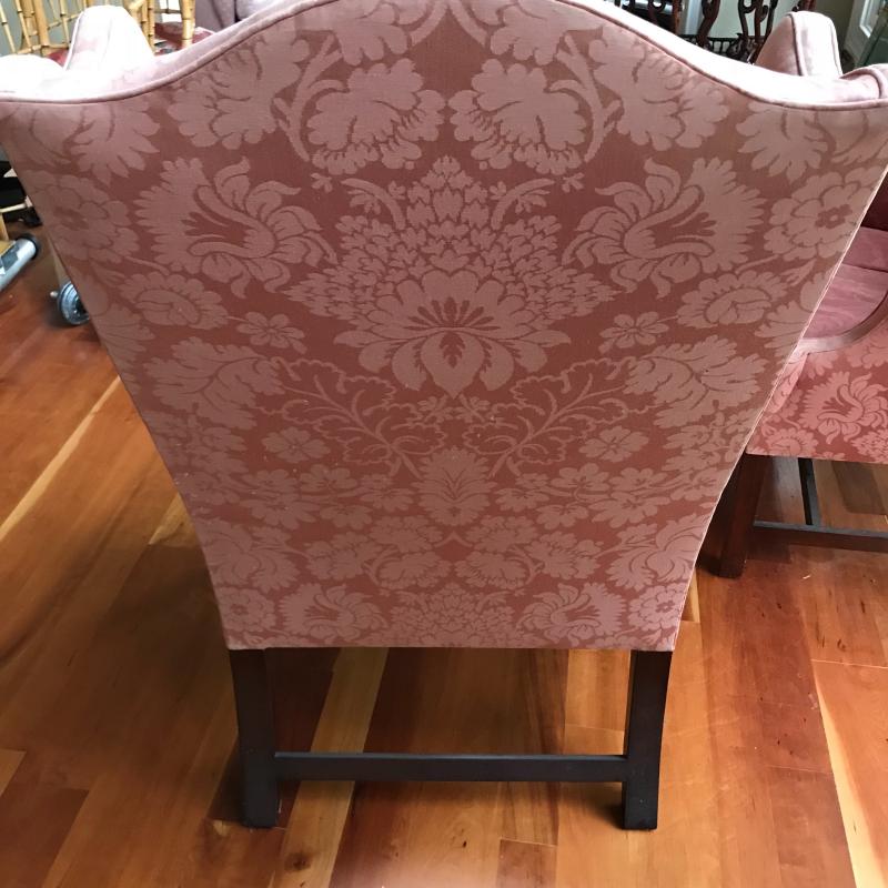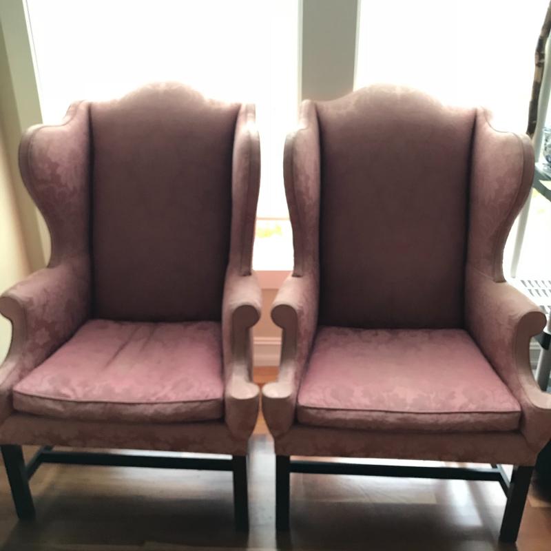 This elegant pair of high-backed wing chairs will add class to your living or bedroom. Upholstery is in decent shape with a few worn spots and light stains on the seats. Manufactured by Kindel. Approx. 31” x 30” x 44” h. See pics. Local pickup only.