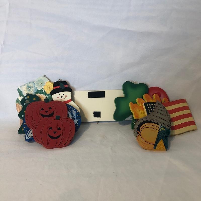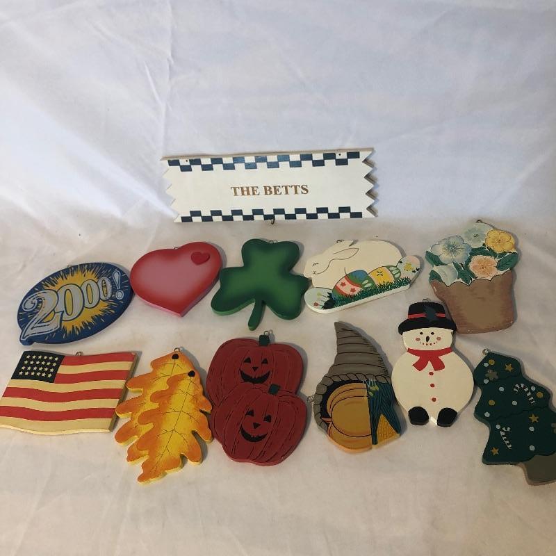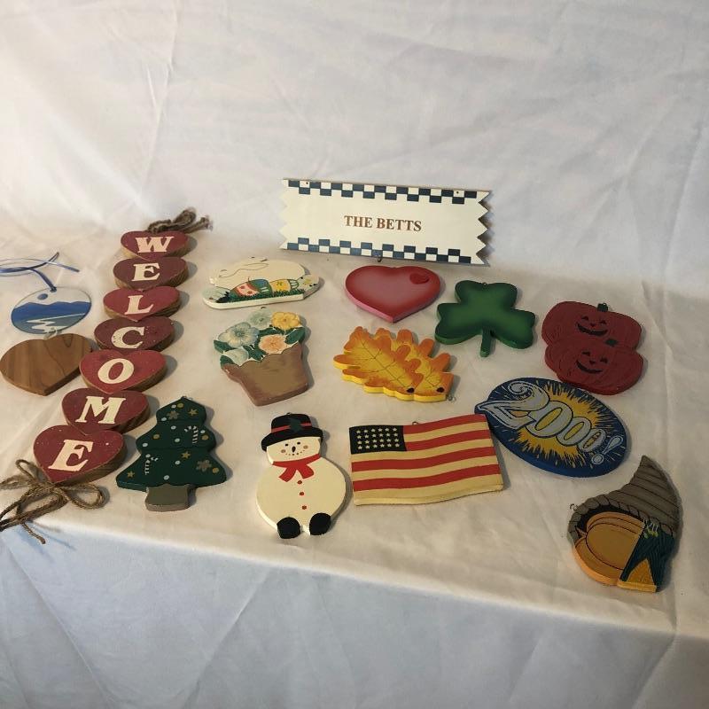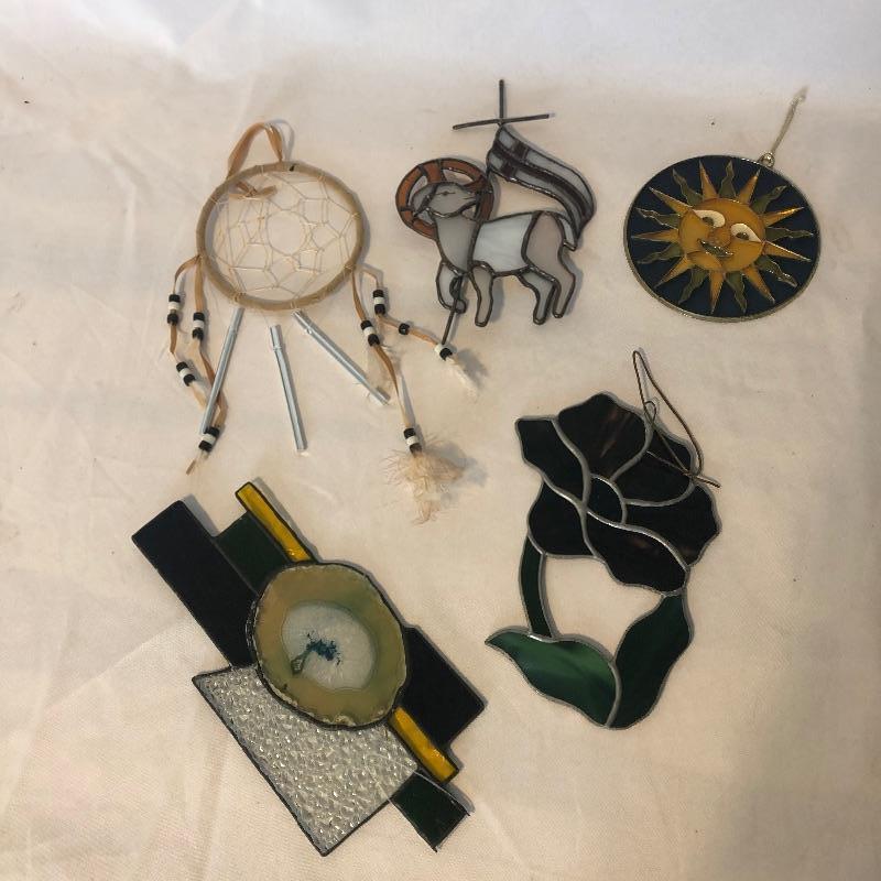 This lot includes many lovely home accents. A wooden WELCOME sign perfect for the front door. It measures 18” long. Also included is a personalized “˜Betts’ sign with an assortment of eleven hanging pieces to meet all of your seasonal celebrations, the final image shows the choices. The main pieces is labeled “Betts” but that could be easily changed to meet your family’s name. The four stained glass pieces are all around 6”. The dream catcher is also around 6”. All pieces are in great condition.