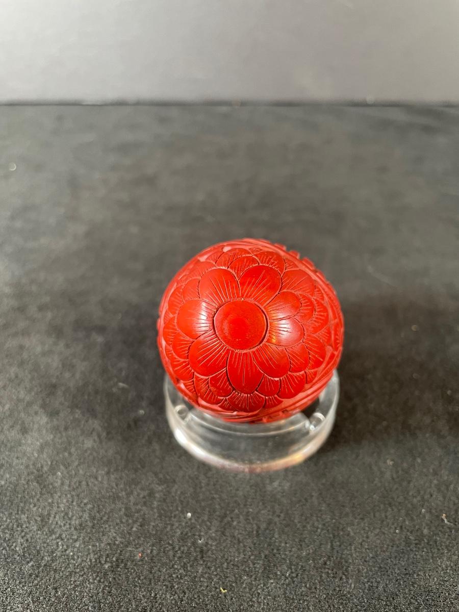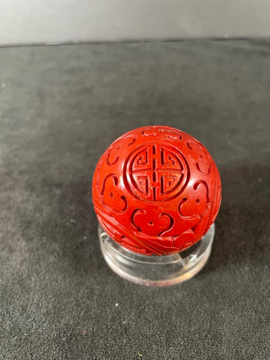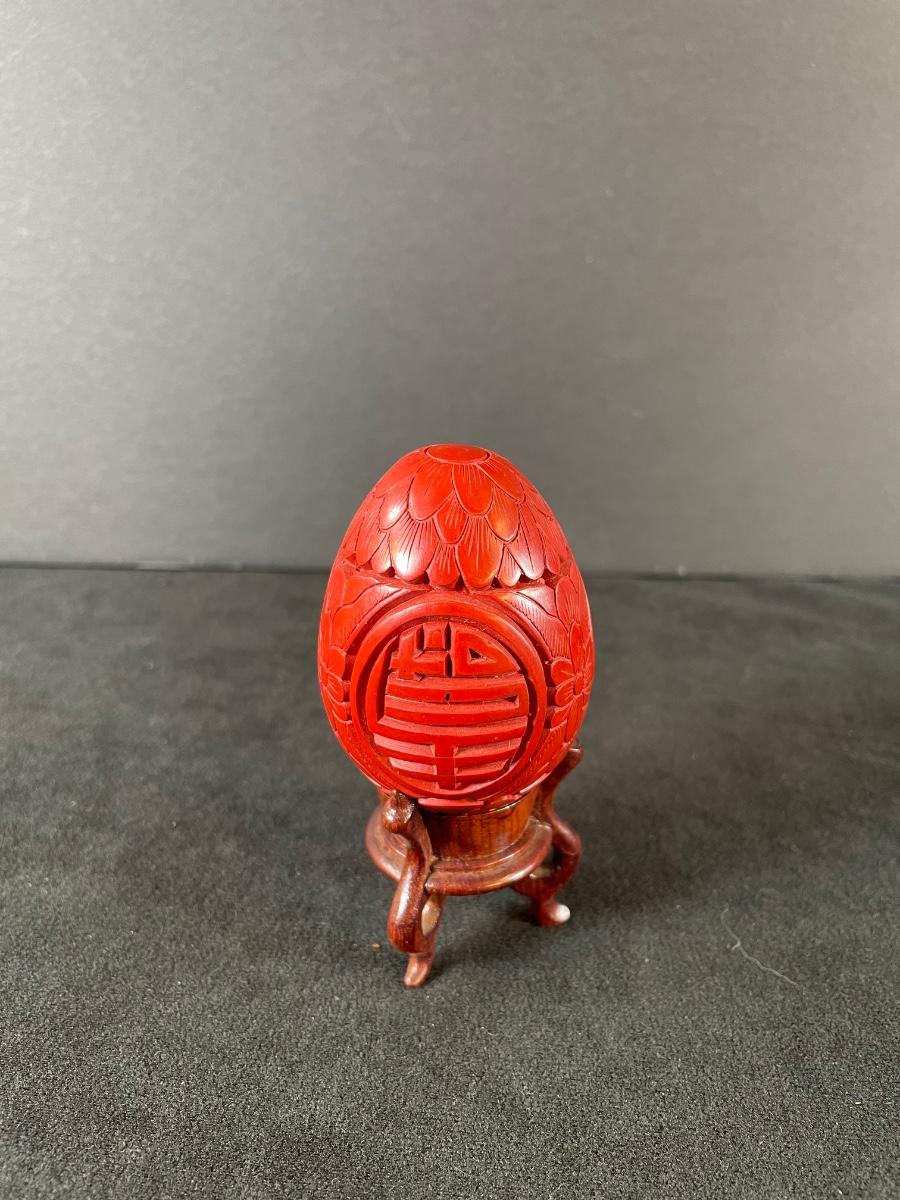 Hand-carved Chinese cinnabar egg on a wooden stand