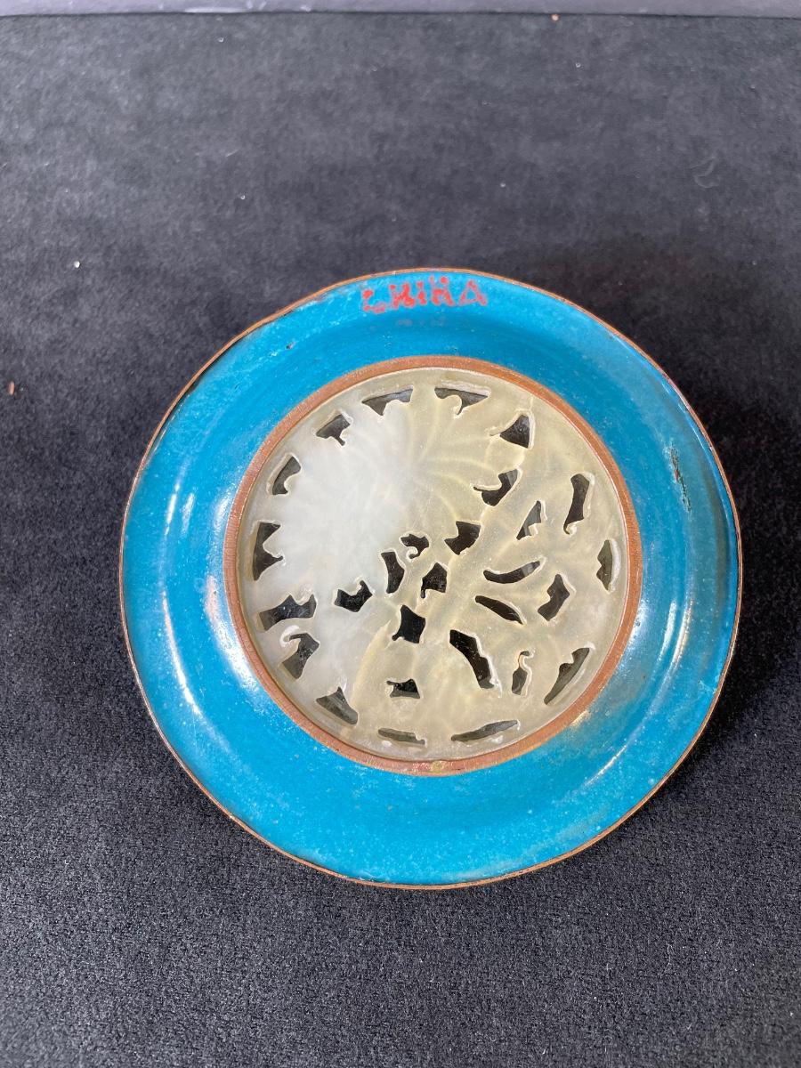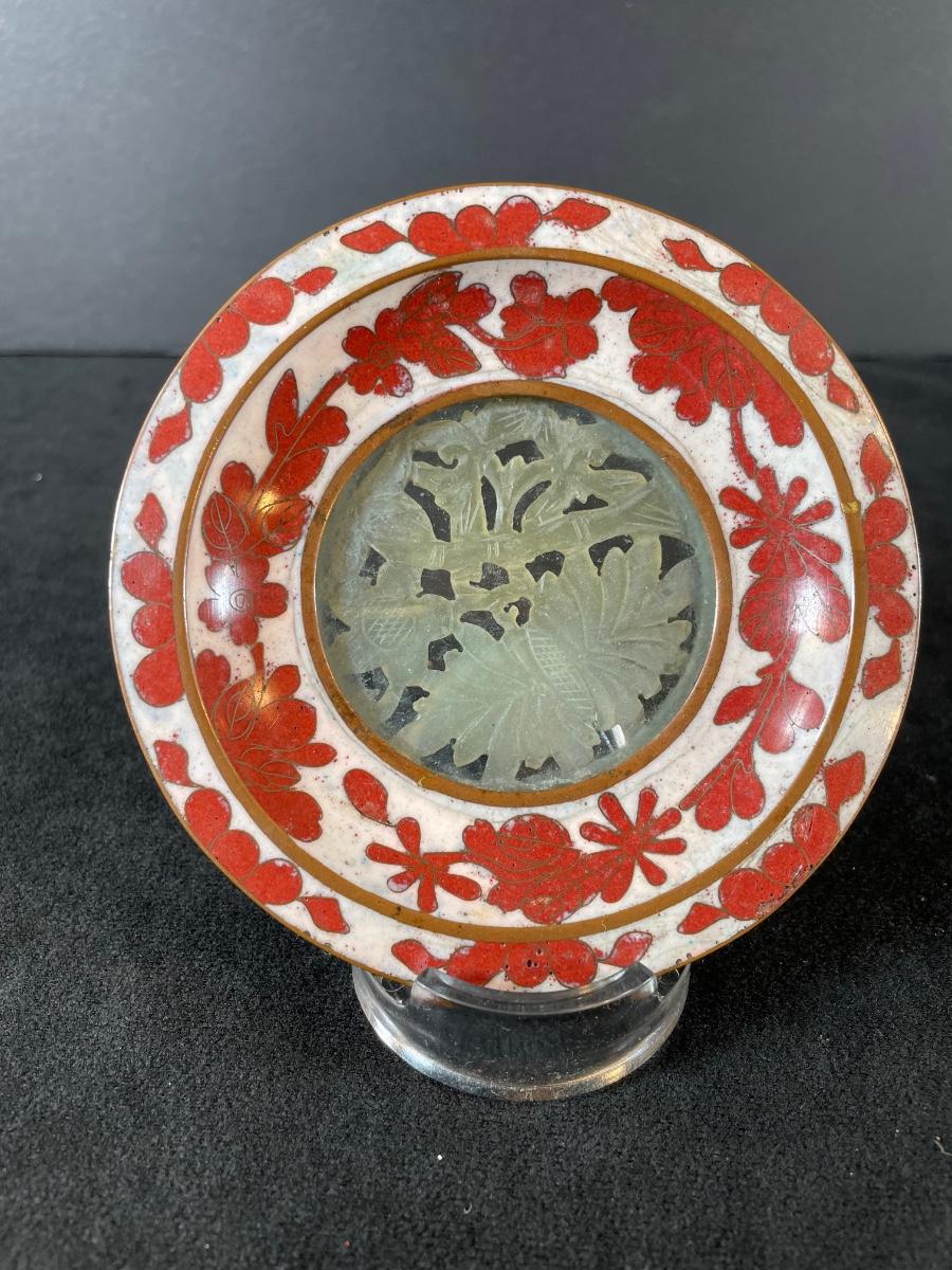 Chinese cloisonne pin dish with carved jade behind glass n the center