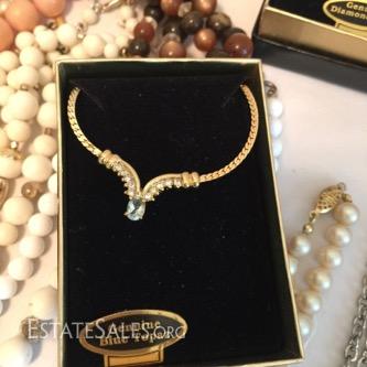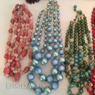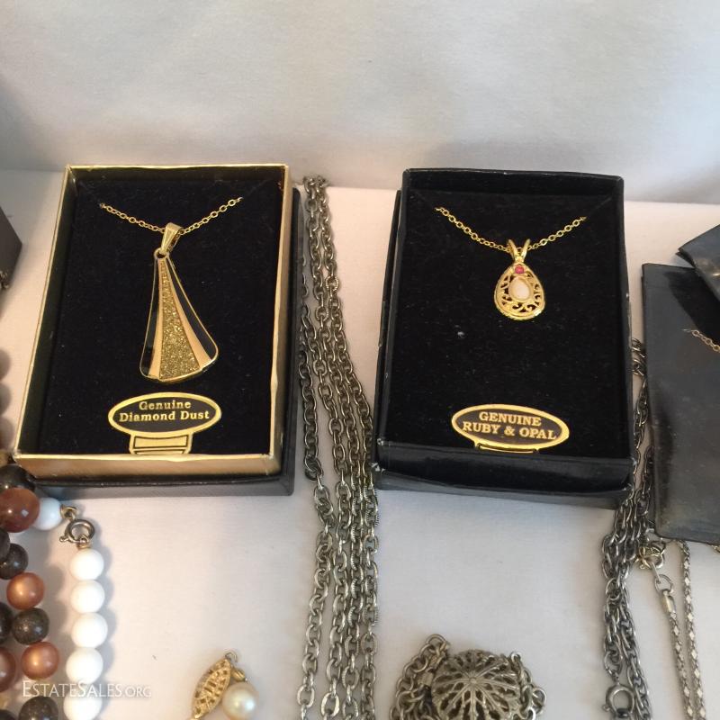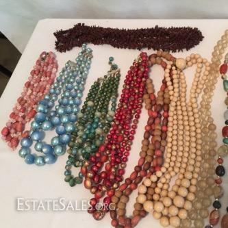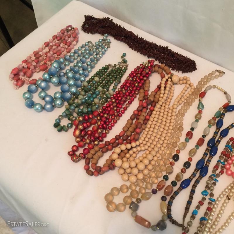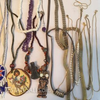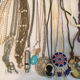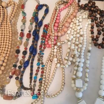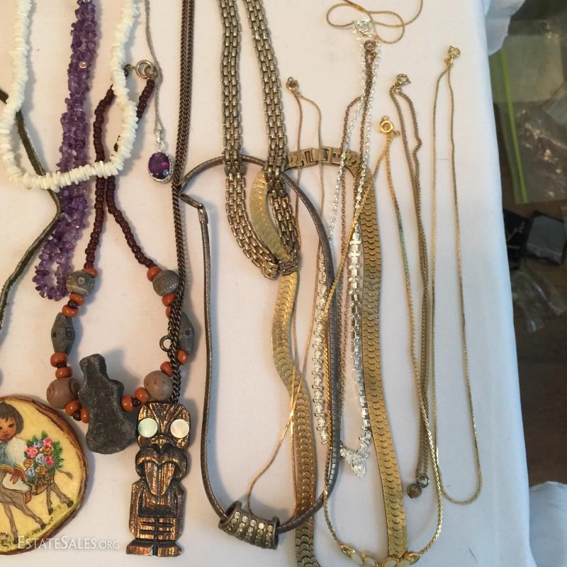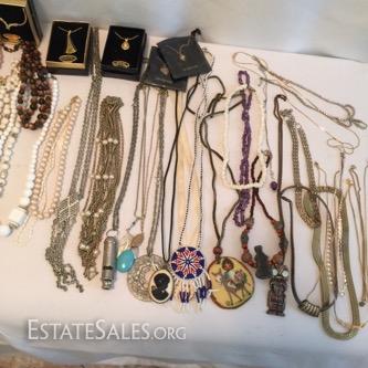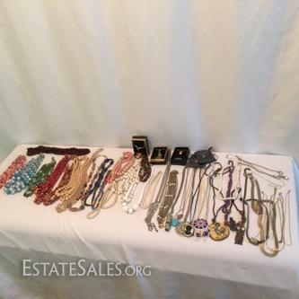 Lot includes several necklaces with pendants, gold tone necklaces, beaded necklaces, shell necklaces and many costume necklaces. All styles and lengths. See photos for details.