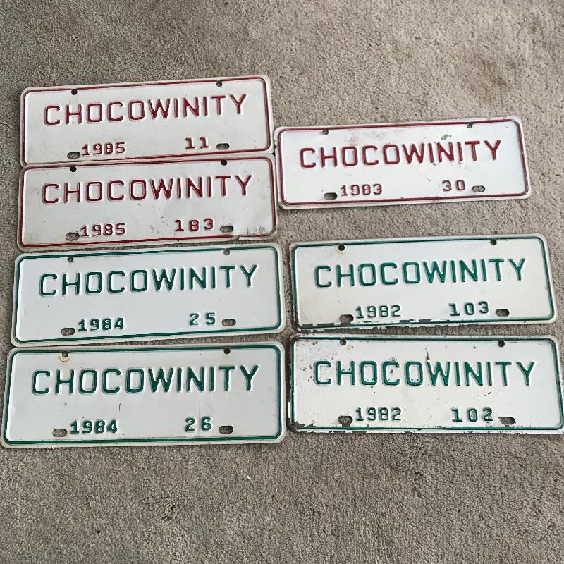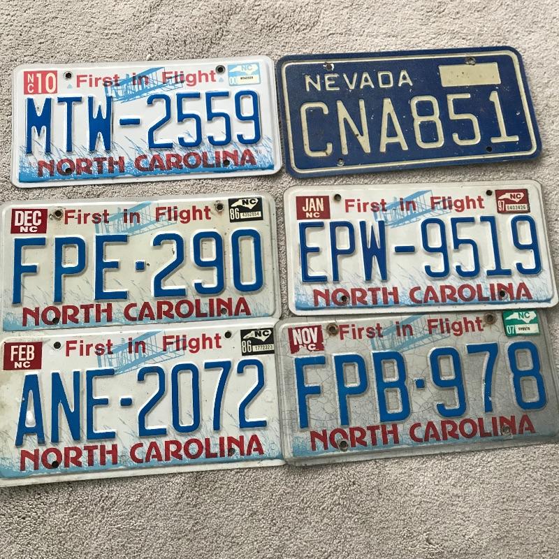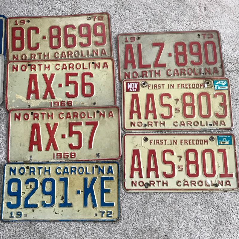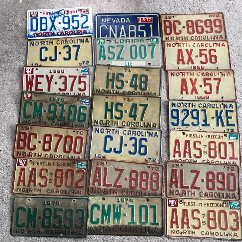 Large collection of vintage license plates, mostly from NC and dating back to the 1960’s. Seven Chocowinty mini plates and two vanity plates complete the lot. See photos. Shipping available.