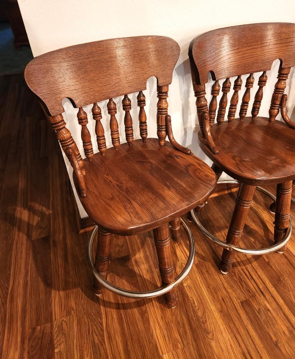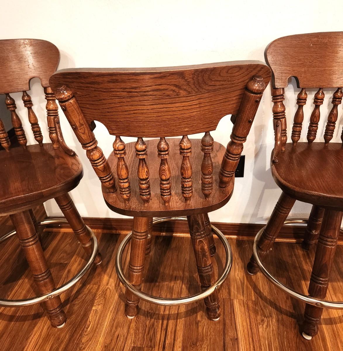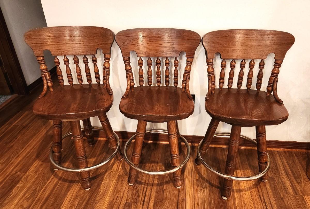 3 Vintage oak barstools, 17.5" across, 38" tall. Good vintage condition. Heavy.