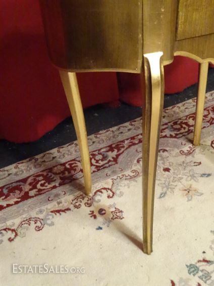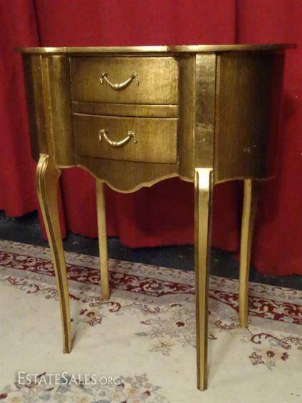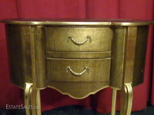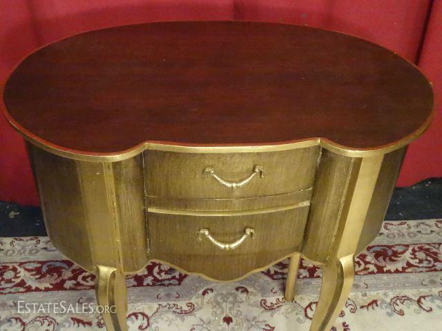 LOT 92: LOUIS XV STYLE GOLD GILT TABLE, KIDNEY SHAPE, 2 DRAWERS WITH BRASS PULLS, VERY GOOD CONDITION, 26"W X 15"D X 30"H, SKU151.72