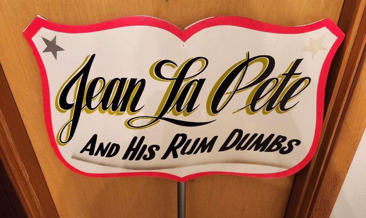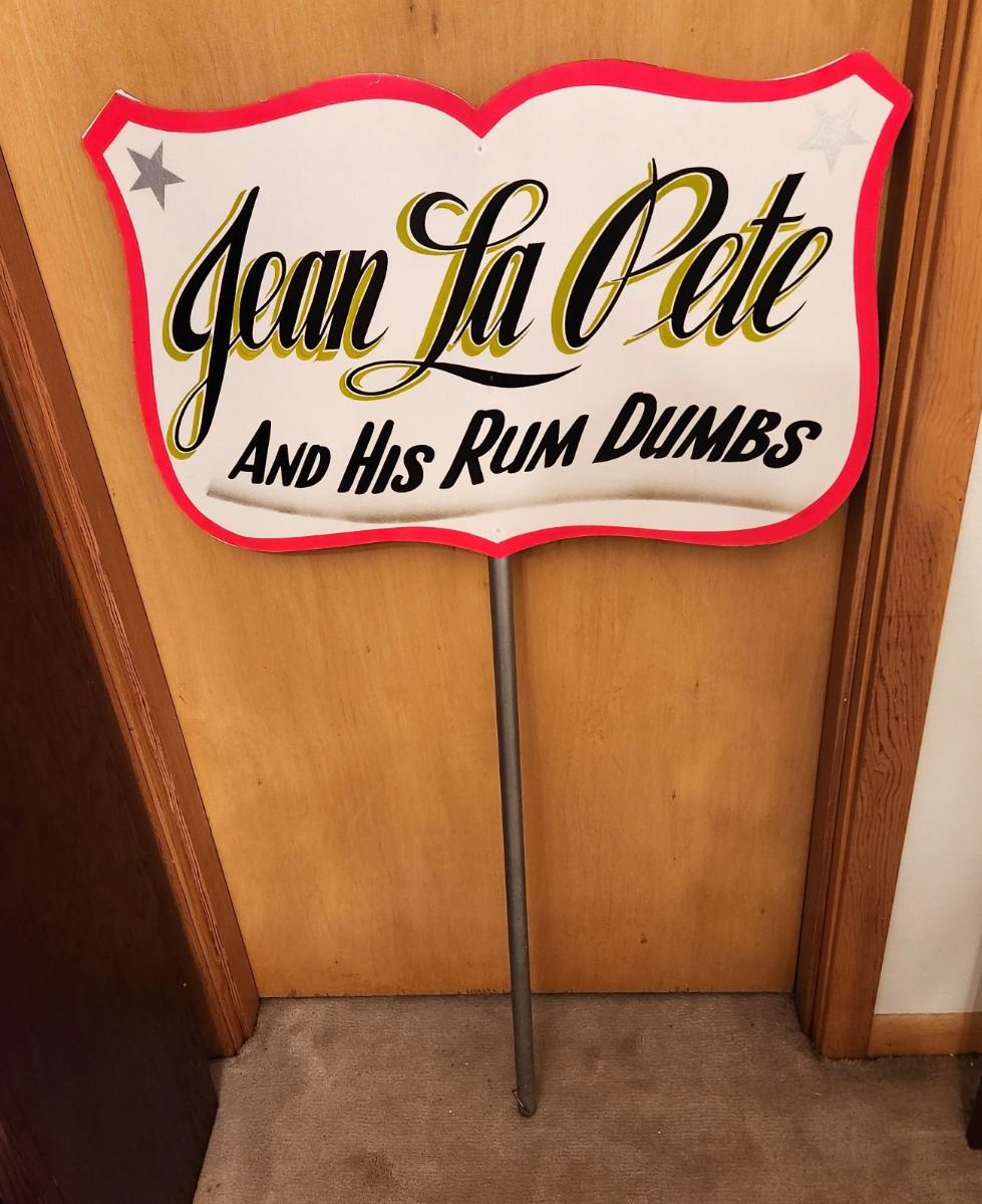 Two sided MG Float Title "Jean La Pete and His Rum Dumbs" - 26" tall, 46" across - on metal pole