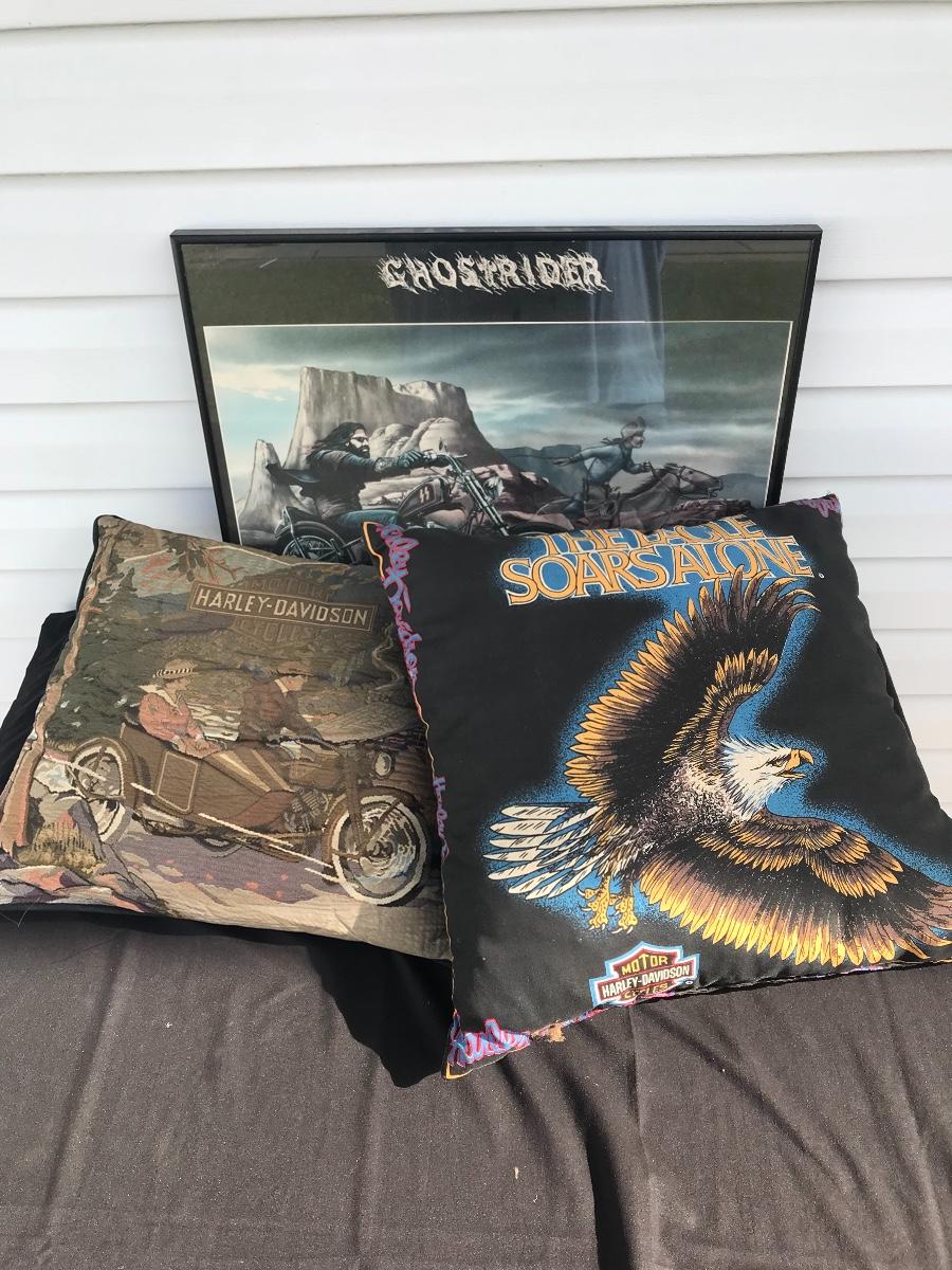 Motorcycle Collectibles - Harley Davidson throw pillows, Ghostrider framed picture. The pictures show condition, measurements if taken, and what is included in the lot. Due to the large amount that we photograph and the time frame, we are not always able to take measurements. All items unless noted, are pre-owned and have been used. If you purchased furniture, you must bring help. We do not allow one person to carry large furniture out on their own. Bring help, tools and a truck for the safety of our client’s homes, and your personal safety. Company policy. Thank you.