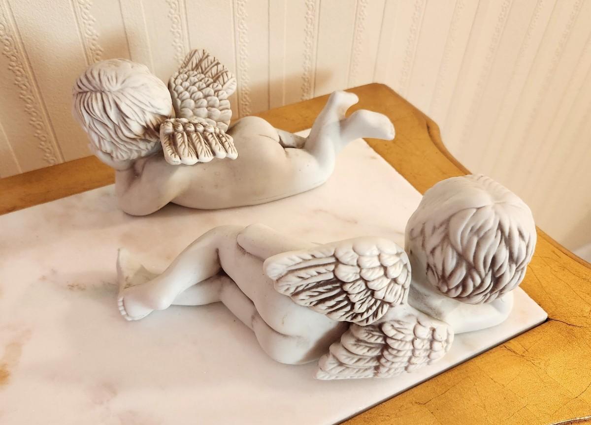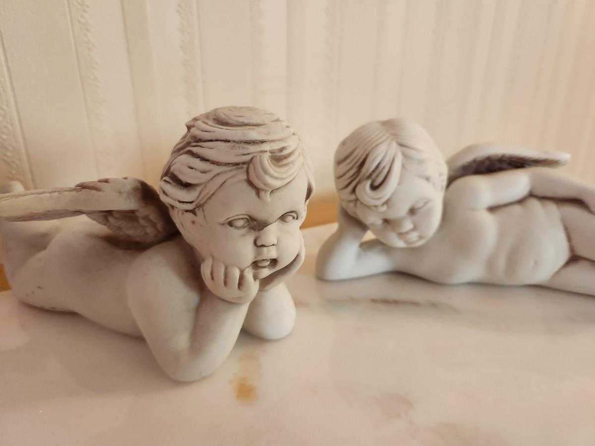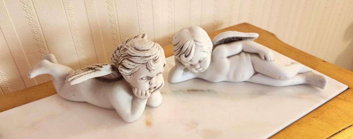 Pair of reclining bisque porcelain cherubs/angels. Each 9" long - good condition.
