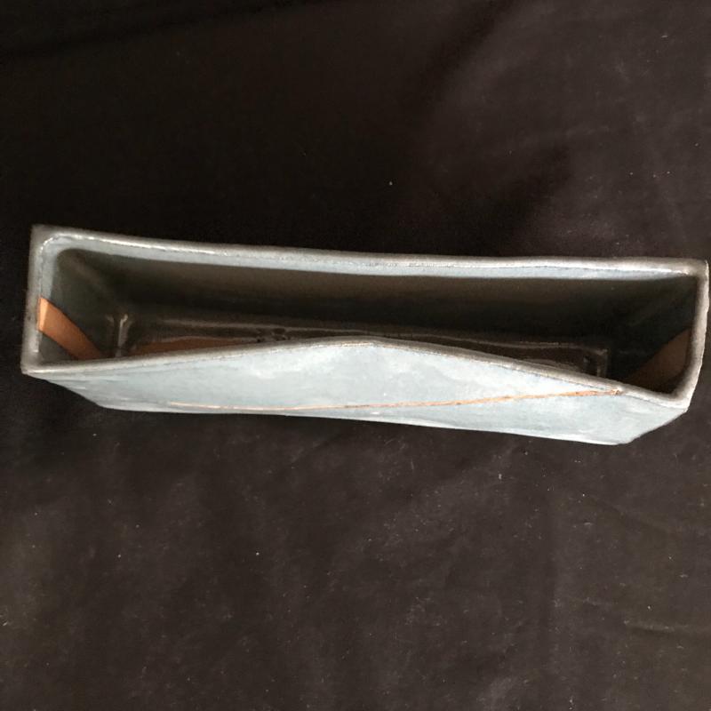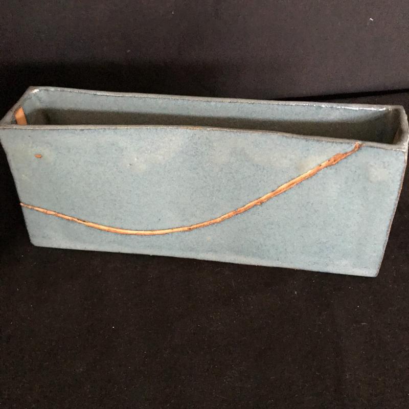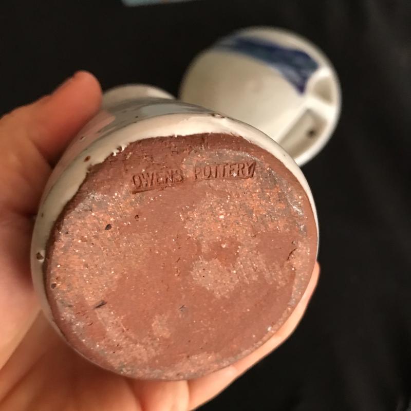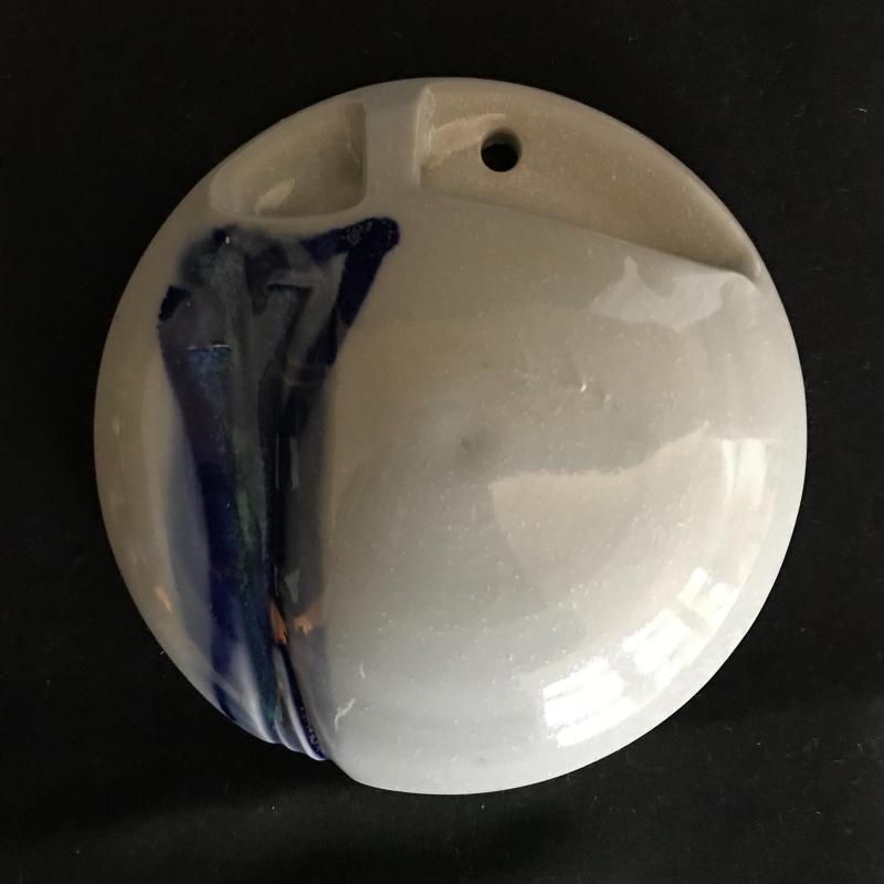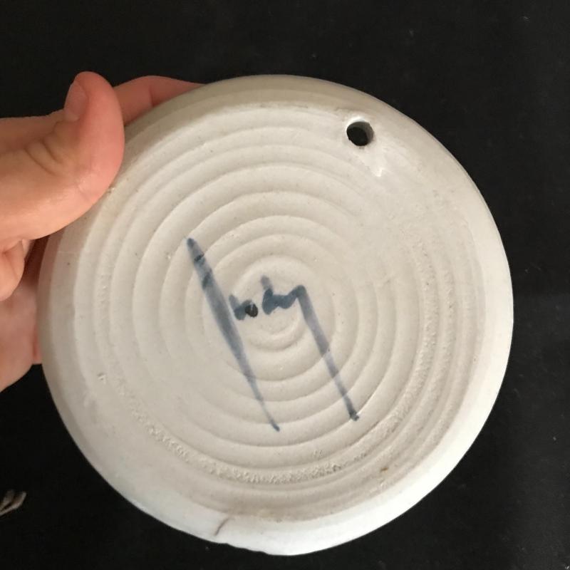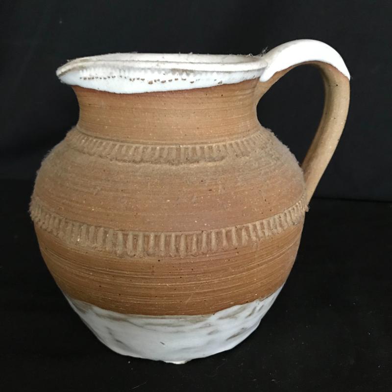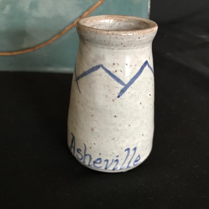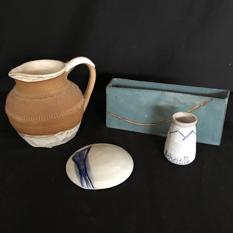 Lot includes four unique pieces of pottery: one pitcher, a circular wall hanging, a small Asheville vase, and a rectangular slab pottery piece. Pitcher is approx. 6.5” tall. Shipping Available.