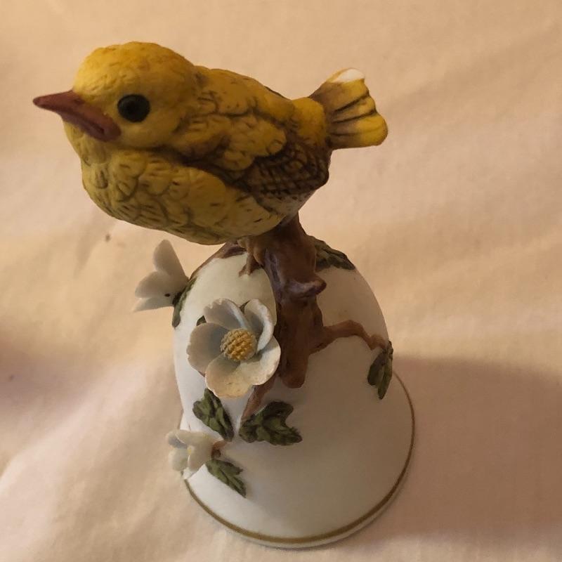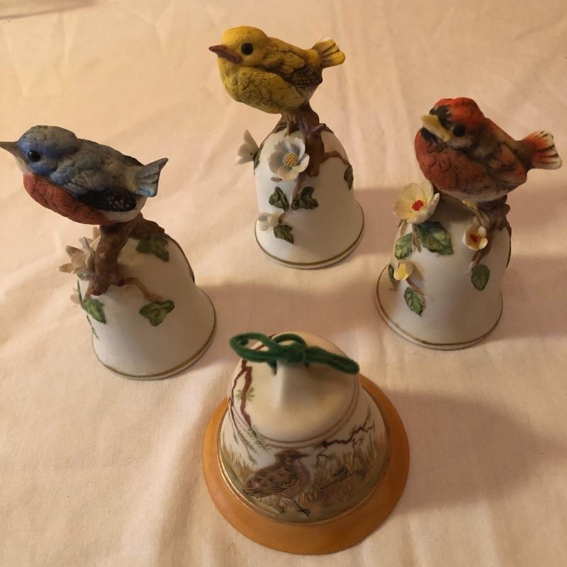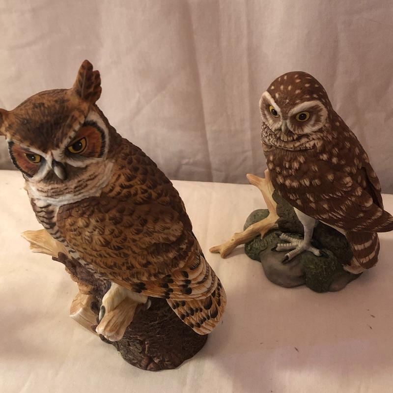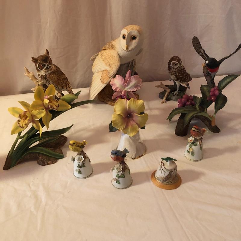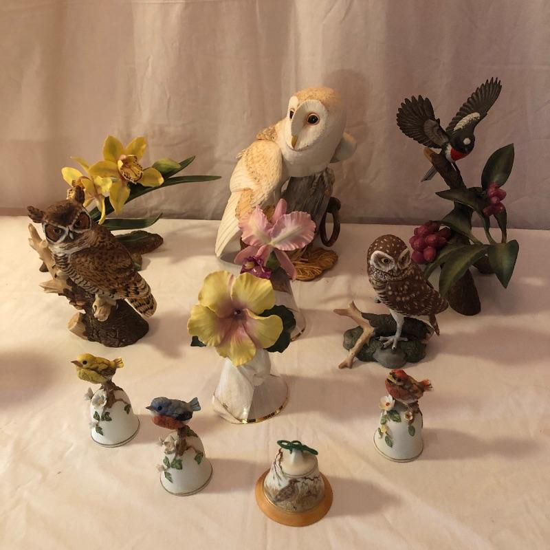 What a great lot! This lot includes eleven pieces: three owl figurines, two floral bells and one floral figurine and five bird figurines (with four being bells). Please note the ringer and pistil is missing from the yellow hibiscus. The largest owl measures approximately 10.5” tall. Shipping Available.