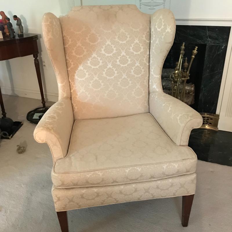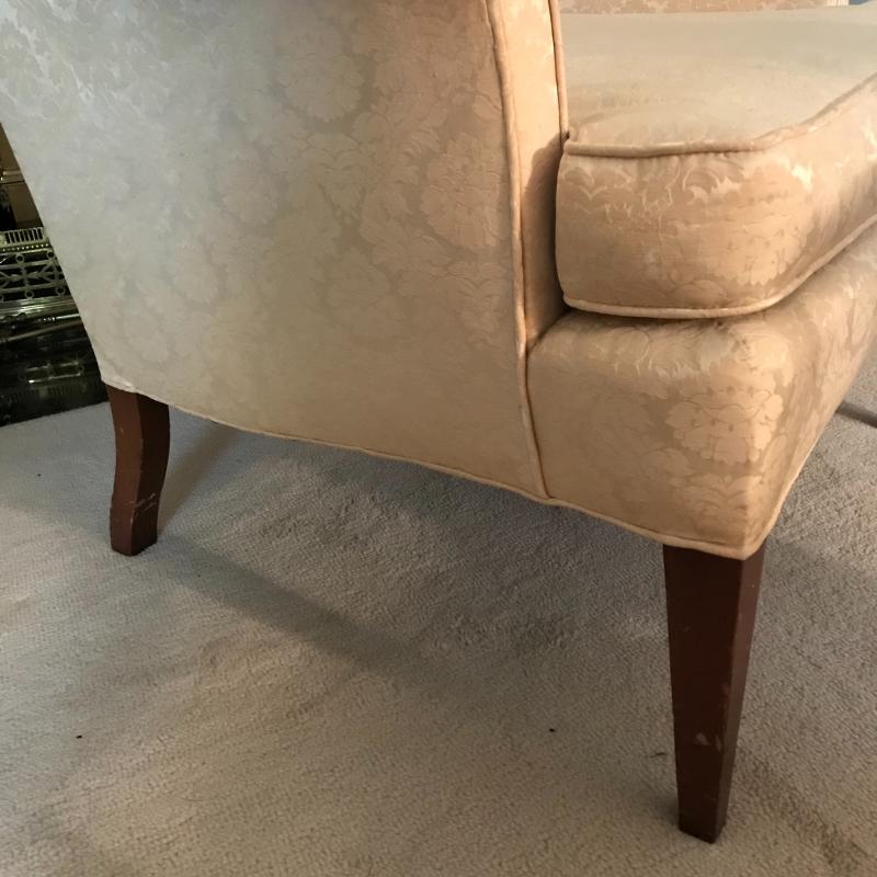 Delicately patterned tallback chair will add elegance to any dwelling. Small stain on fabric and minor scratches on wood, see photos. Chair measures approx. 32.5x5x42” No Shipping.