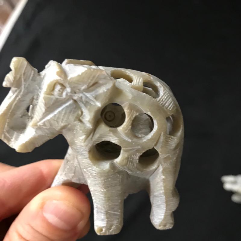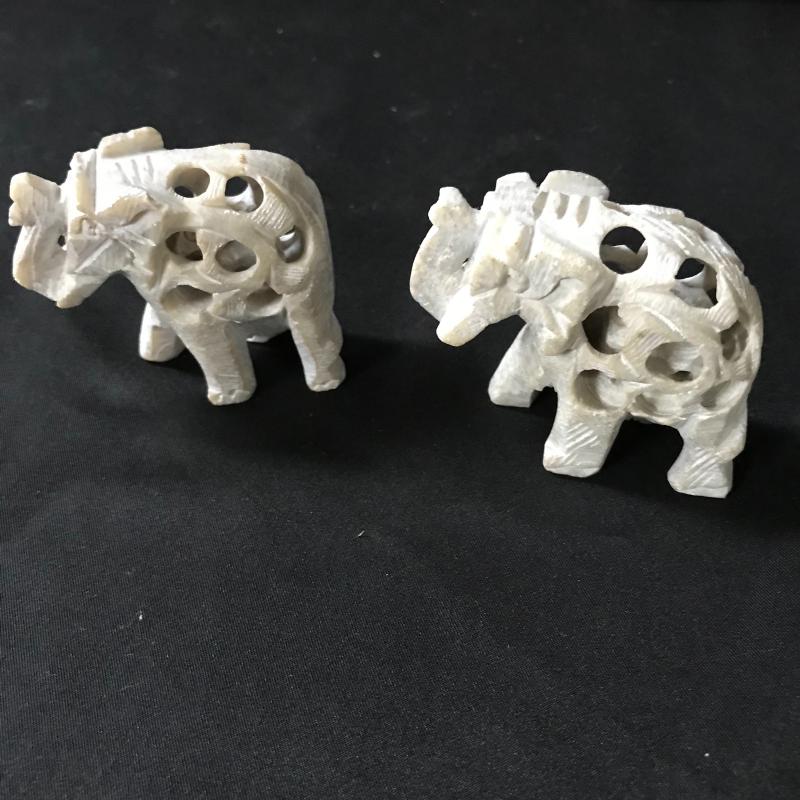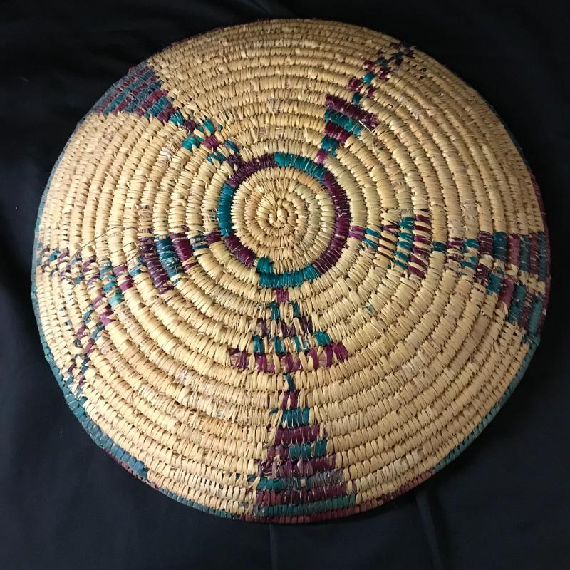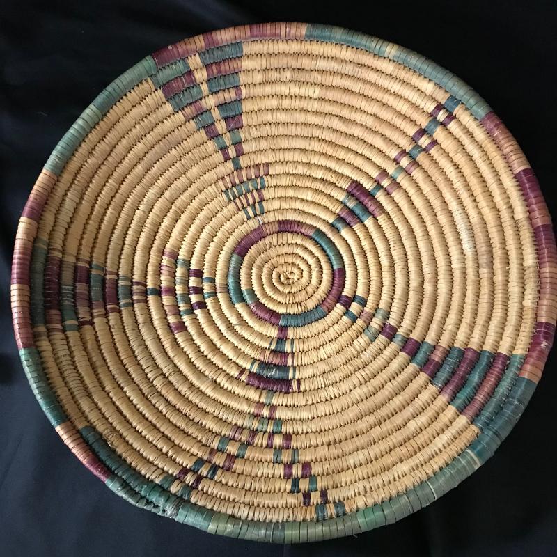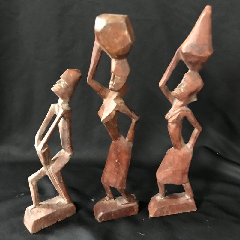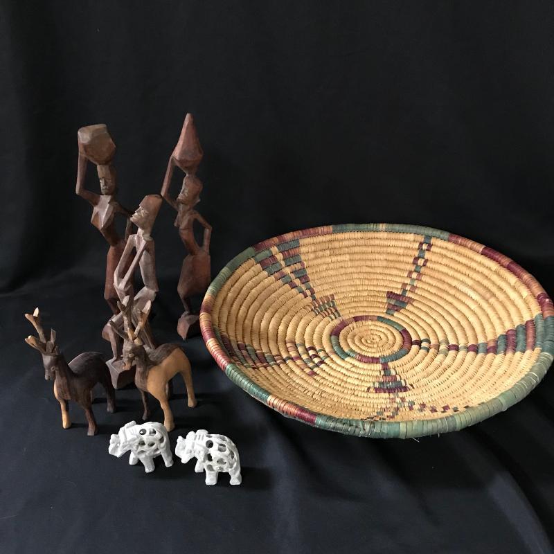 Shallow, sturdy woven basket is in good shape and 16.5” in diameter. Tallest person figurine is 11.5” tall. Antelope-looking figurines are approx. 7” tall. One has broken antler. Mama elephants appear to be carved of soapstone and have baby elephants inside them. Approx. 2” tall.