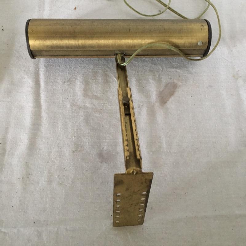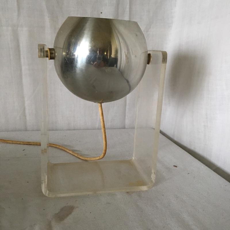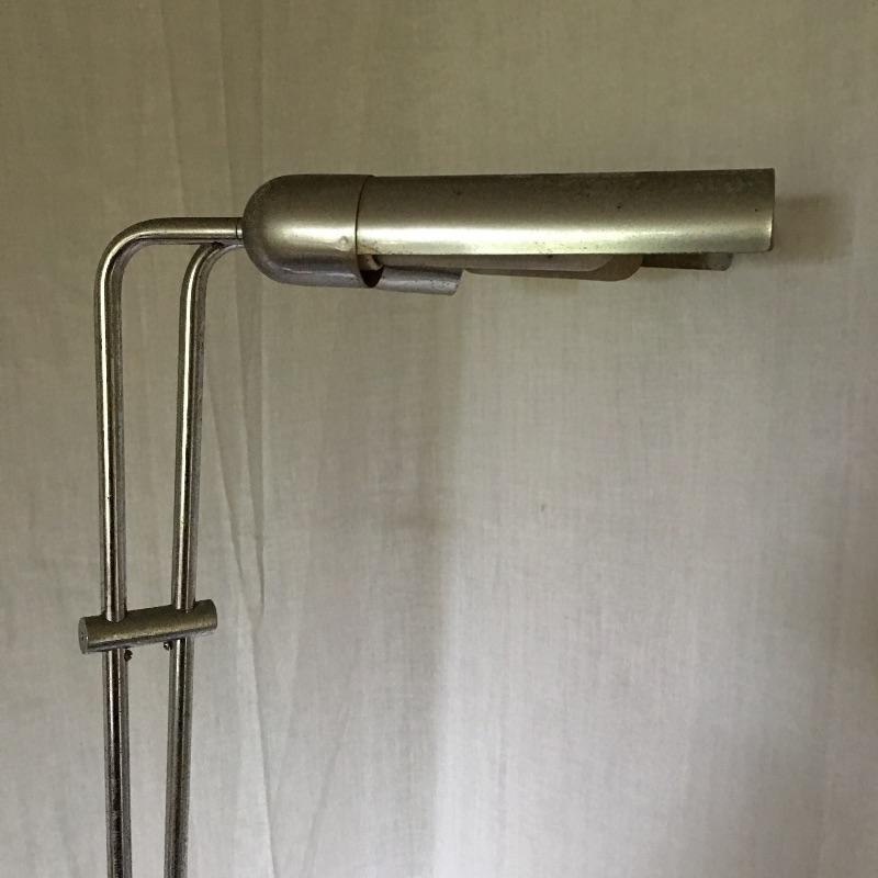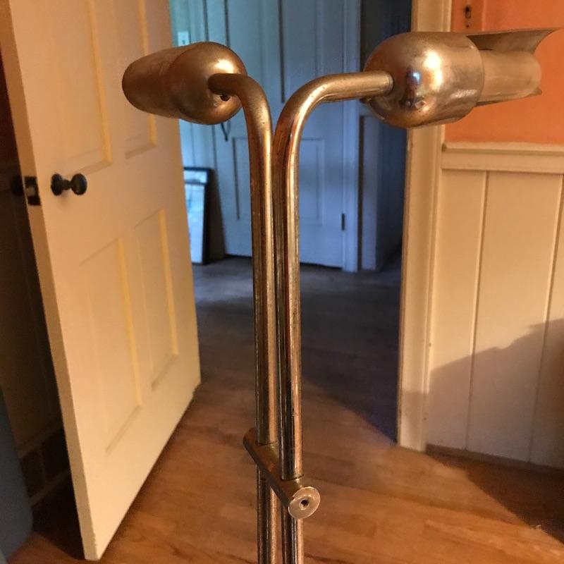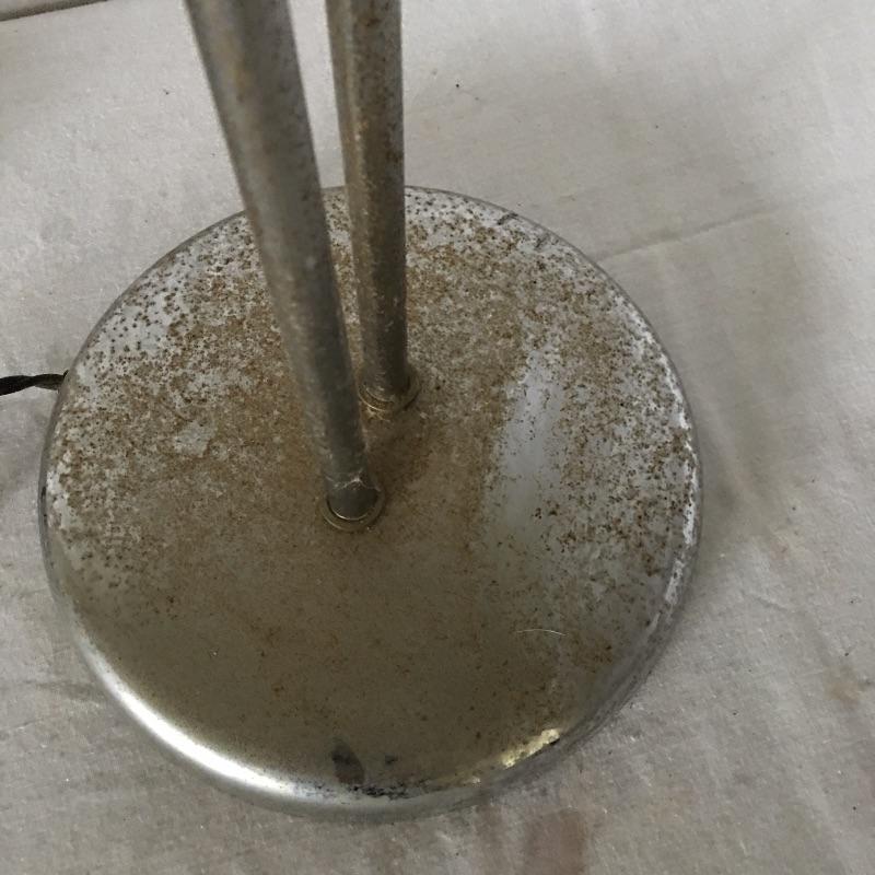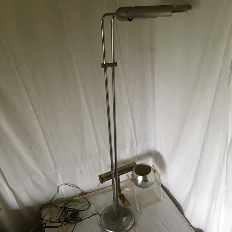 Trio of lights includes a chrome floor lamp, brass extending lamp and a chrome and plexiglass MCM lamp (needs to be rewired). The other two lamps work. All three lamps could use a good cleaning, but with a little elbow grease could look great. Floor lamp measures 45” tall with a 8”D base.