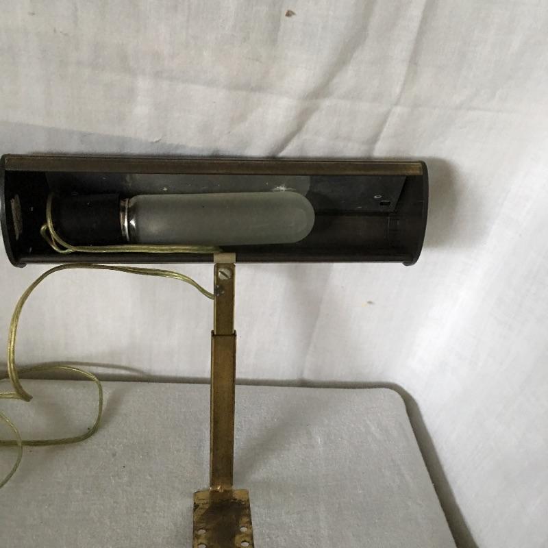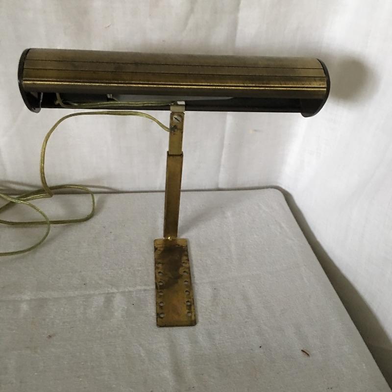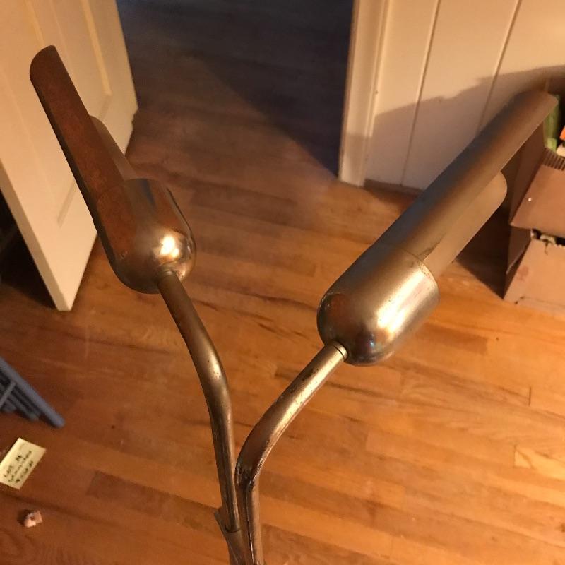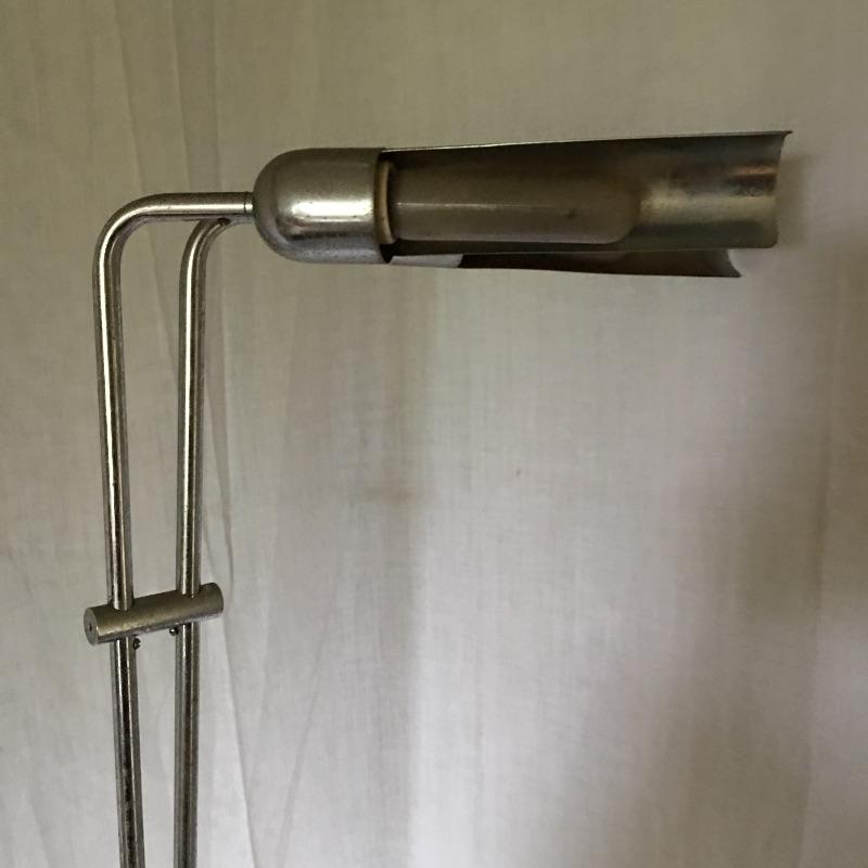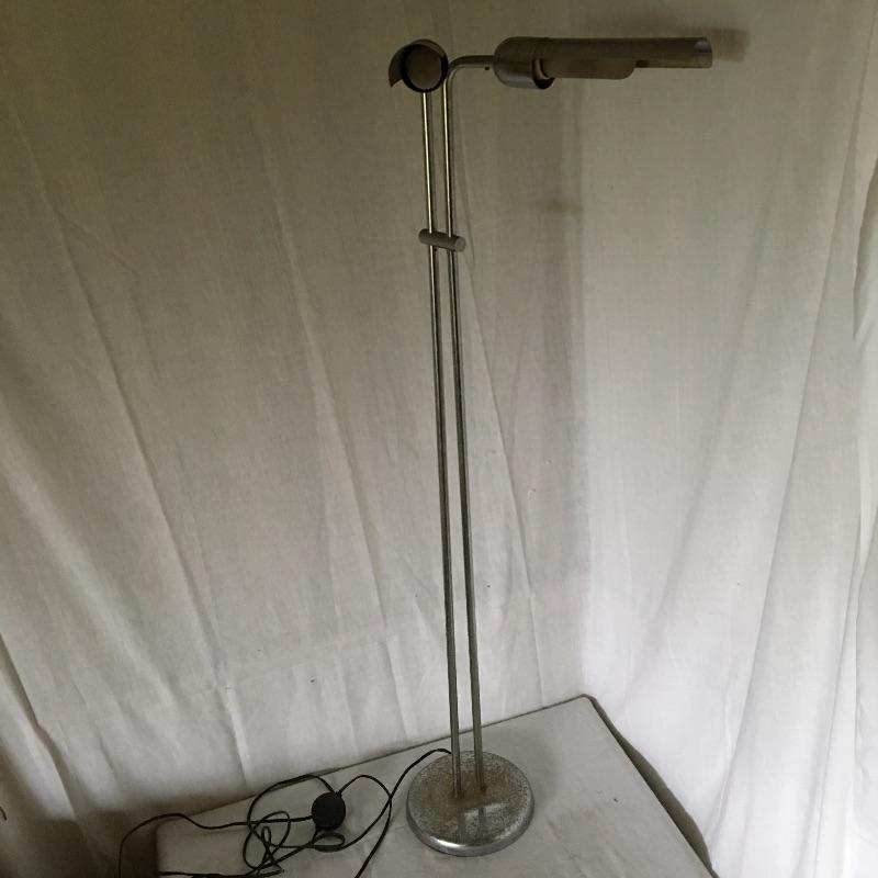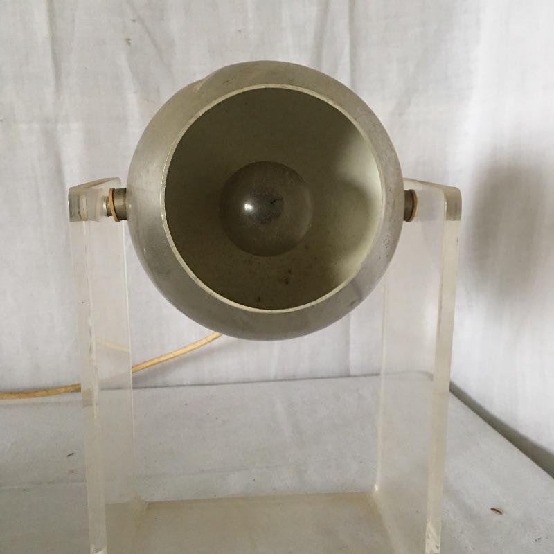 Trio of lights includes a chrome floor lamp, brass extending lamp and a chrome and plexiglass MCM lamp (needs to be rewired). The other two lamps work. All three lamps could use a good cleaning, but with a little elbow grease could look great. Floor lamp measures 45” tall with a 8”D base.