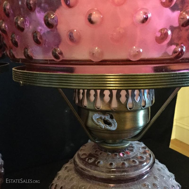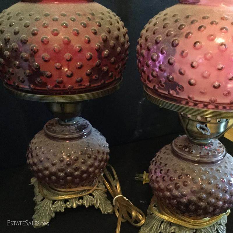 Set of two matching cranberry colored hobnail glass base & shade lamps with brass hardware.