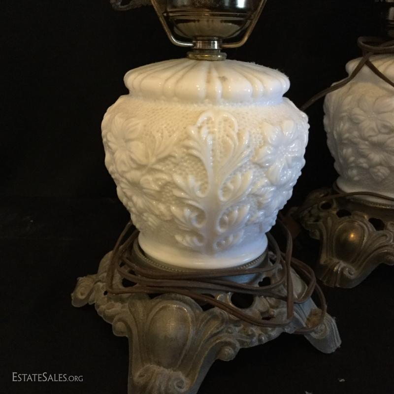 Set of two matching white milk glass base and shade lamps with brass hardware.
