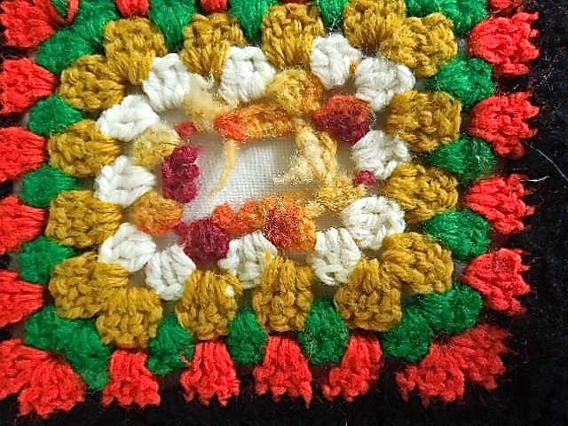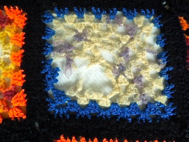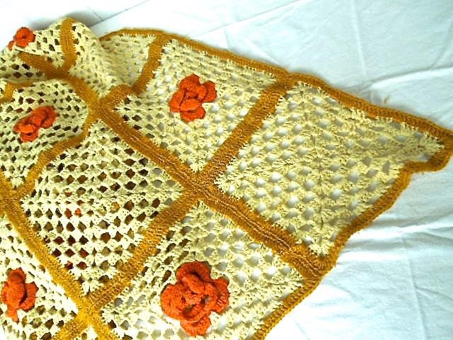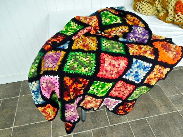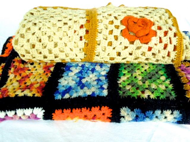Two colorful vintage crocheted afghans made of acrylic and cotton yarn. Granny square afghan with black panes has several holes that will need mending and there is considerable pilling. The yellow window pane afghan has orange rosettes and is in excellent clean condition. These are both throws and not bedspreads.