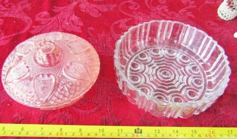 2 GLASS BOWLS, PINK GLASS DISH WITH LID, VINTAGE PERFUME BOTTLE (EMPTY) AND MORE