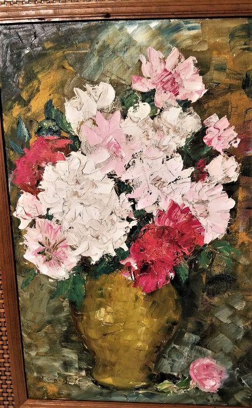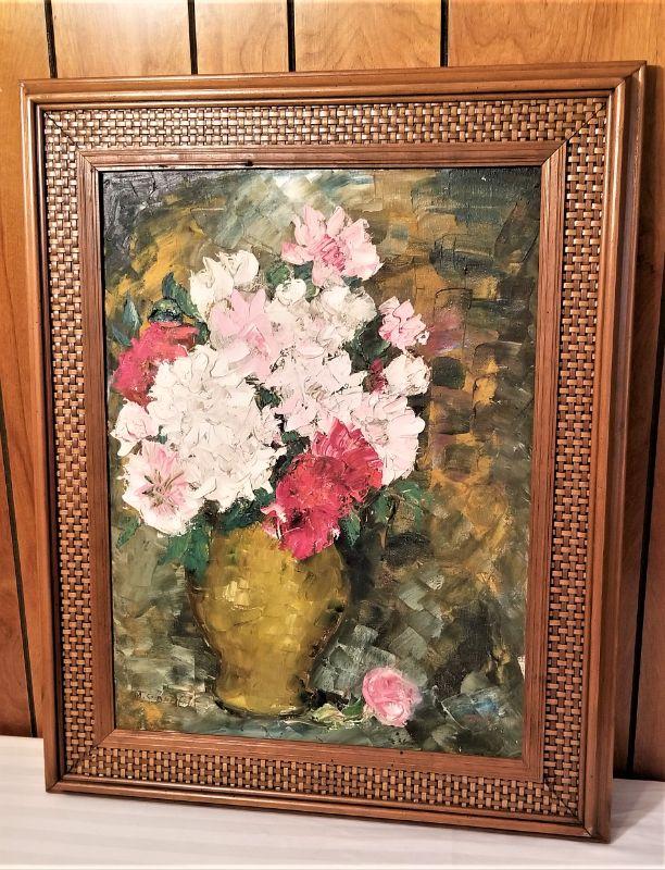 Floral Still Life by well-listed artist Melba Duke Gianelloni (1914 - 2012). Born in Alabama, she studied at Newcomb College and owned an art gallery - The Artist Colony - on Chartres Street for many years. She considered herself an American Impressionist. She married Mr. Gianelloni in 1969, so this painting dates from after that. MidCentury frame - has been in this household for years and probably purchased directly from the artist - so it is fresh to the secondary market. This artist's work has been sold by many local auction houses, including Neal Auction. Excellent condition - measures 25" across, 31" tall. A real sleeper and probably the best thing in the sale. There is a very modest reserve on this item - it if doesn't sell, it's going to a local auction house.