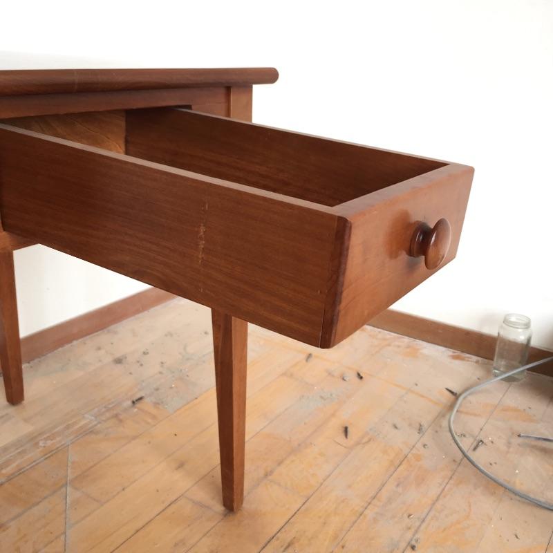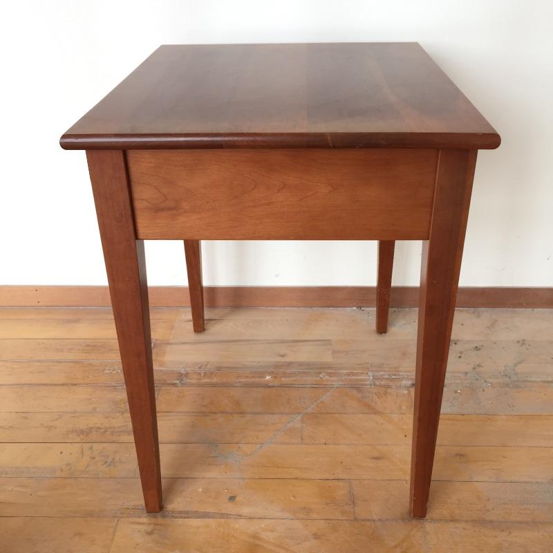 This elegant medium wood tone wooden table has one drawer.