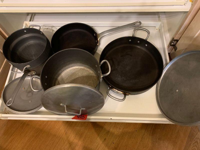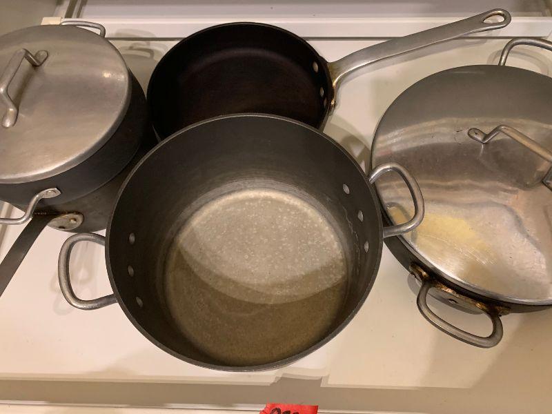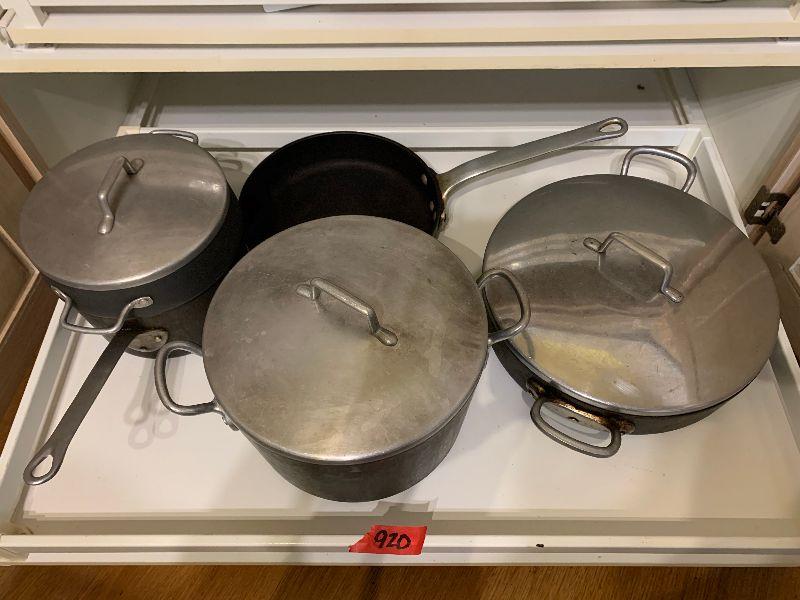 Pots and Pans: 1 3qt Magnalite with steamer, 1 7qt pot magnalite, 1 12" magnalite all with lids and 1 10" magnalite (no lid)