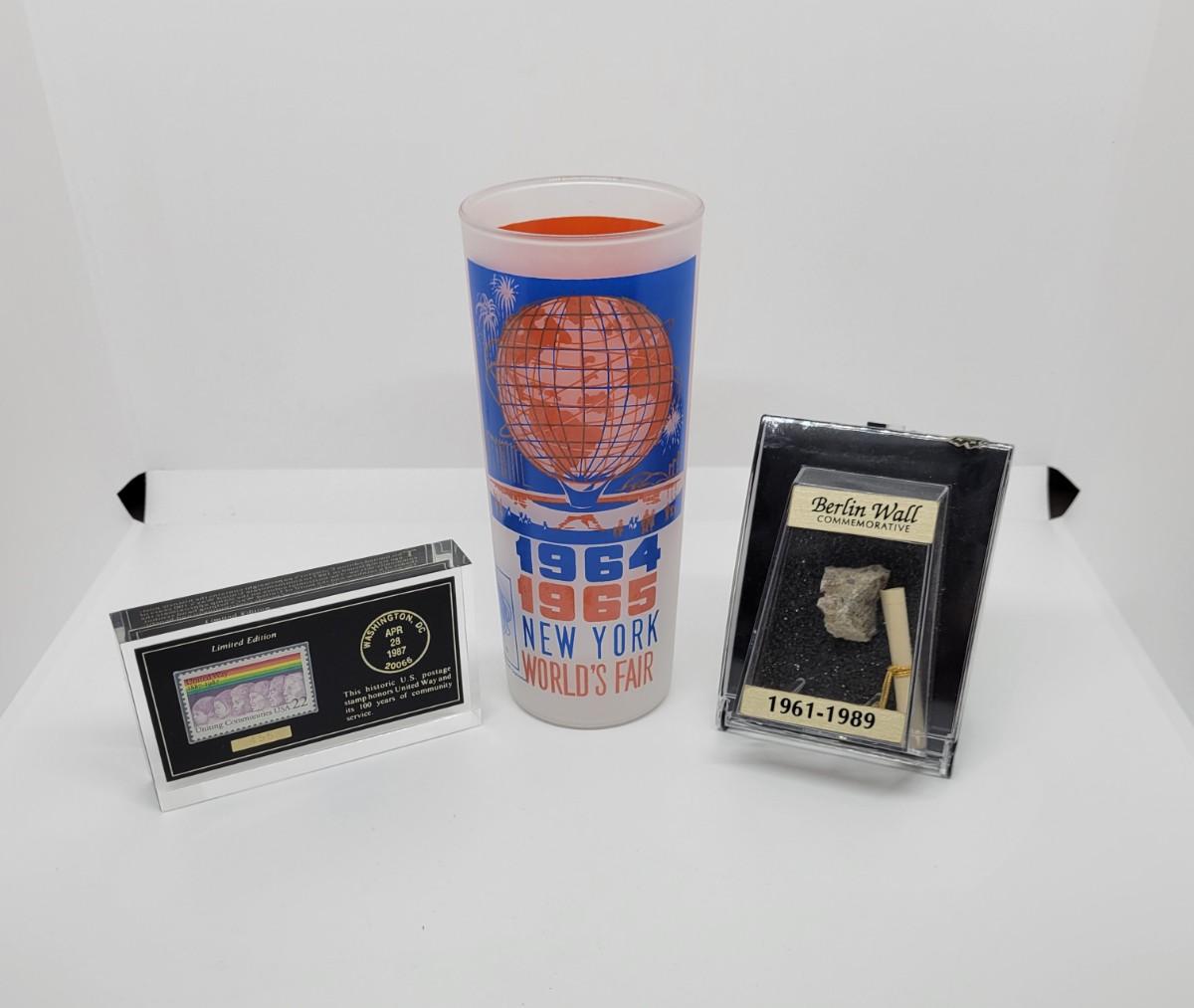 LOT 315L: Souvenir Lot - '64-65 Worlds Fair, Berlin Wall Piece, Stamp