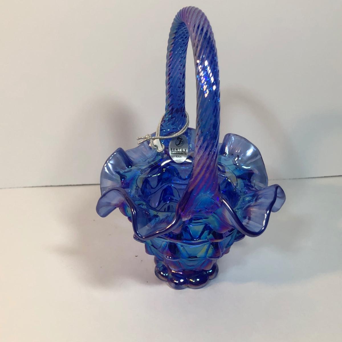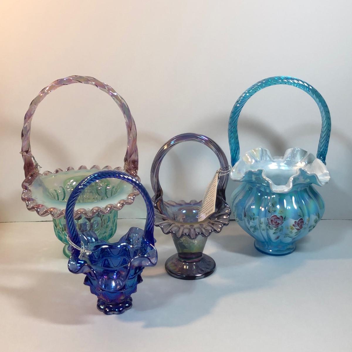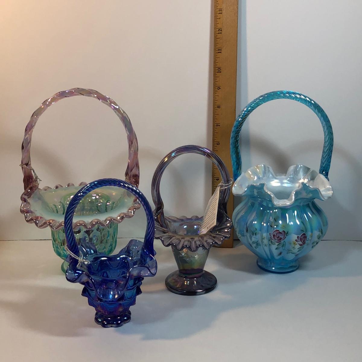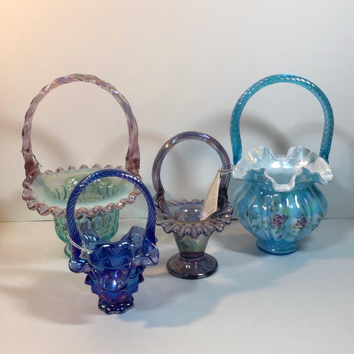 LOT 23M: Fenton Baskets: Blue Topaz Overlay Glass Basket, 95th Anniversary Basket, Cobalt Blue Iridescent Basket & Iridescent Multicolored Basket