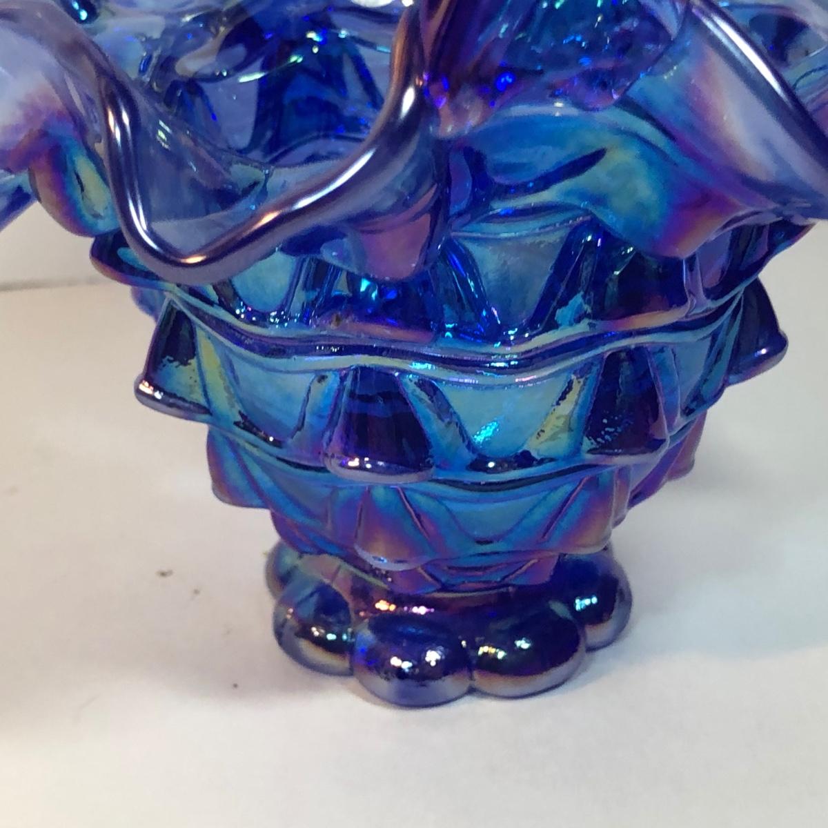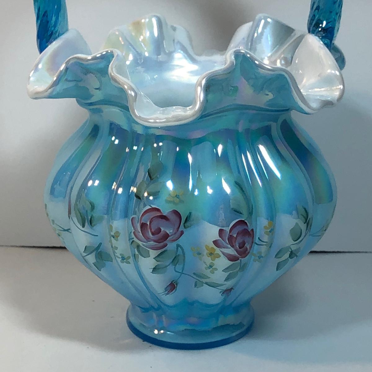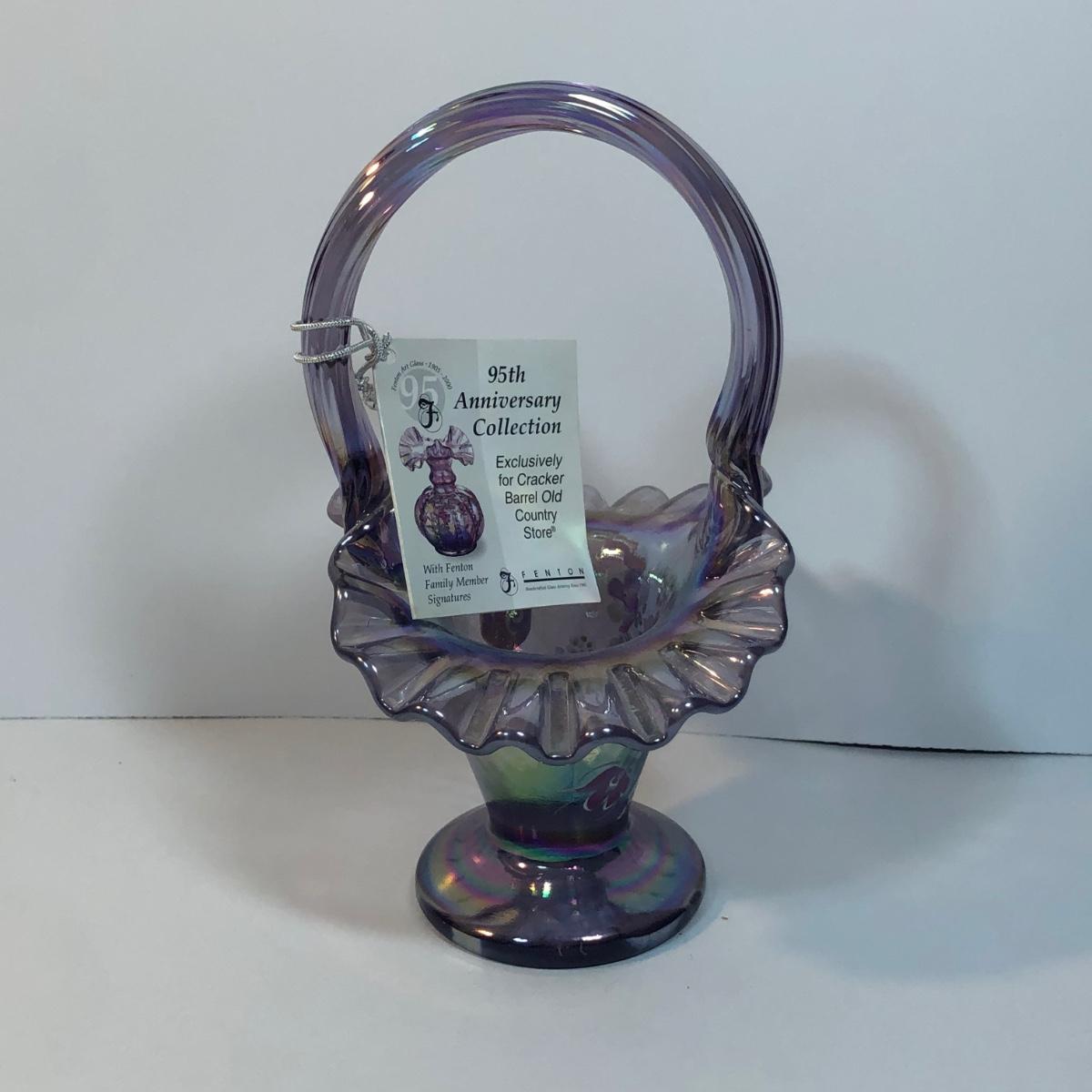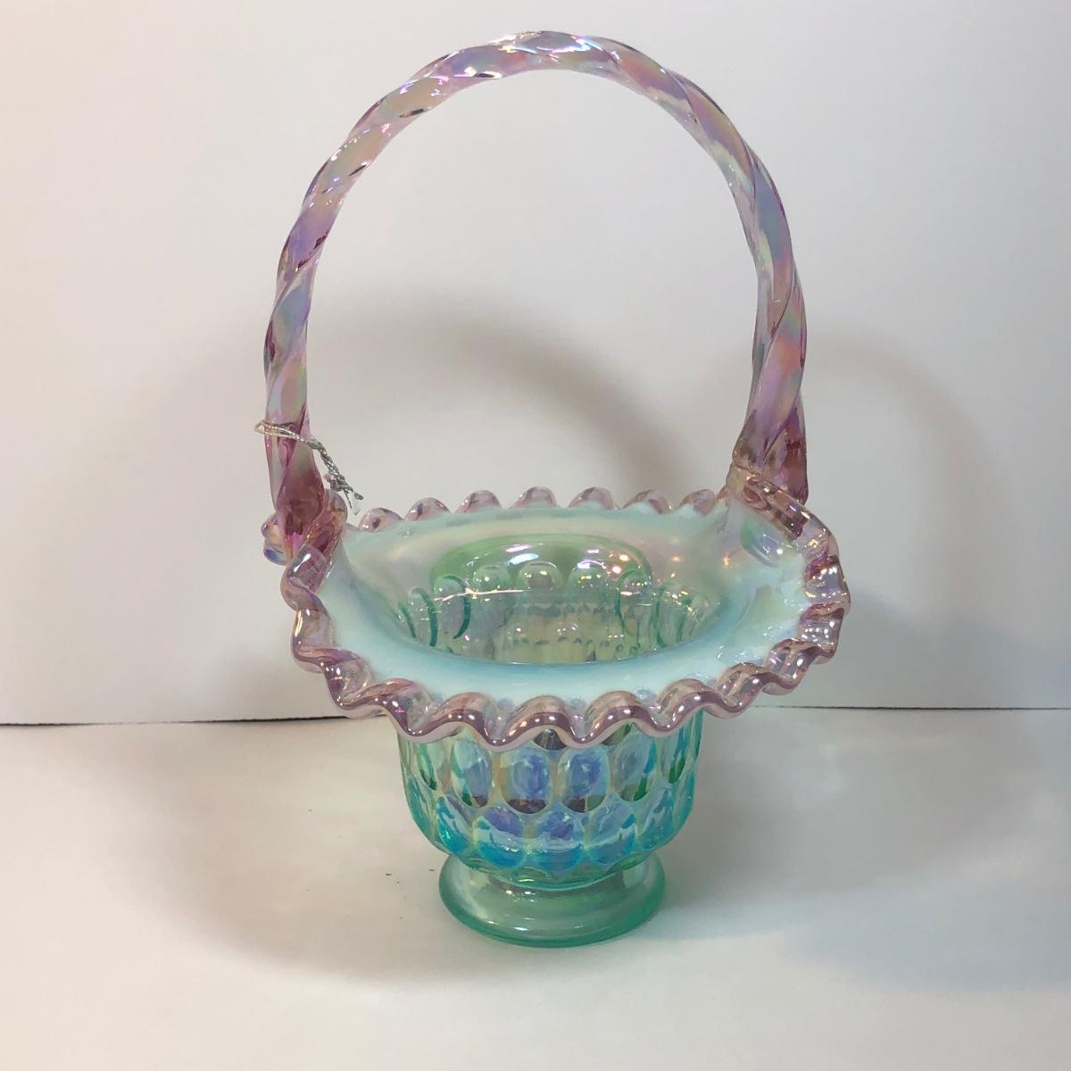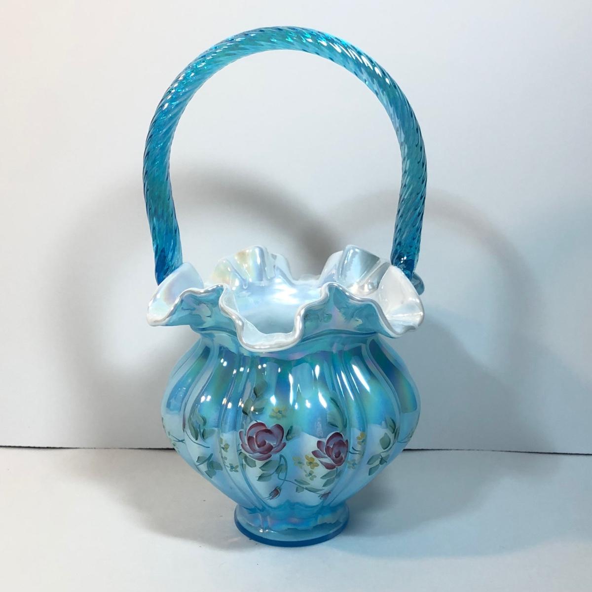 LOT 23M: Fenton Baskets: Blue Topaz Overlay Glass Basket, 95th Anniversary Basket, Cobalt Blue Iridescent Basket & Iridescent Multicolored Basket