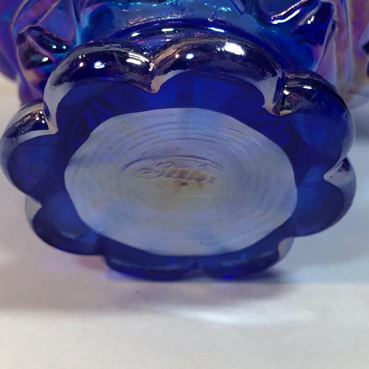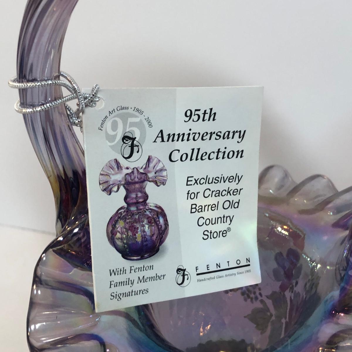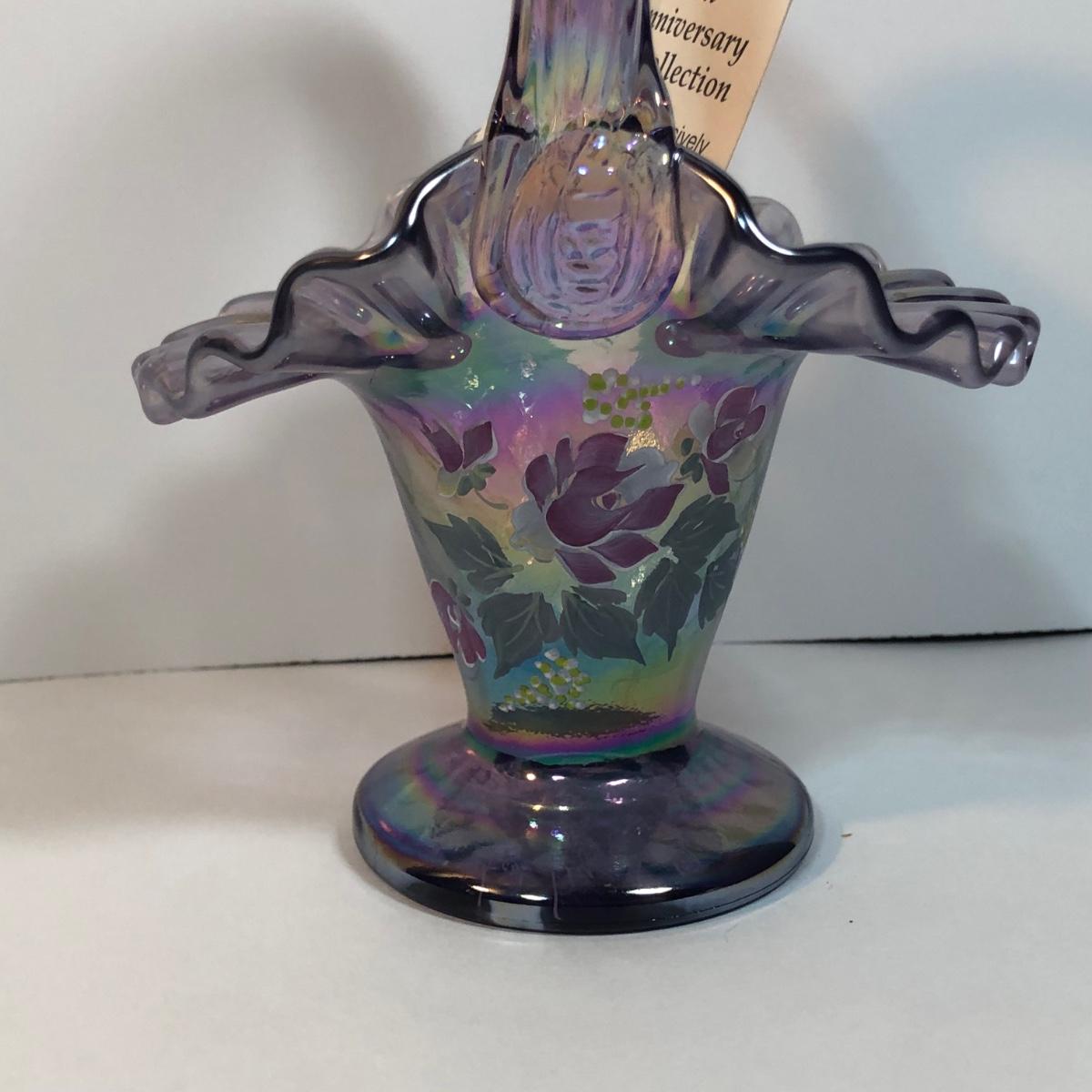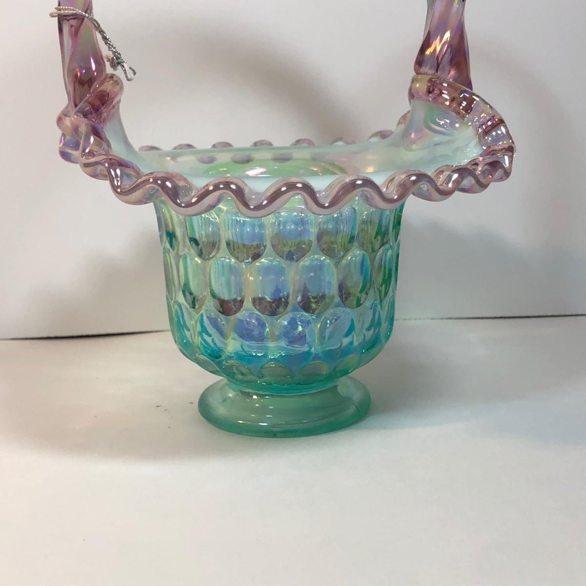 LOT 23M: Fenton Baskets: Blue Topaz Overlay Glass Basket, 95th Anniversary Basket, Cobalt Blue Iridescent Basket & Iridescent Multicolored Basket