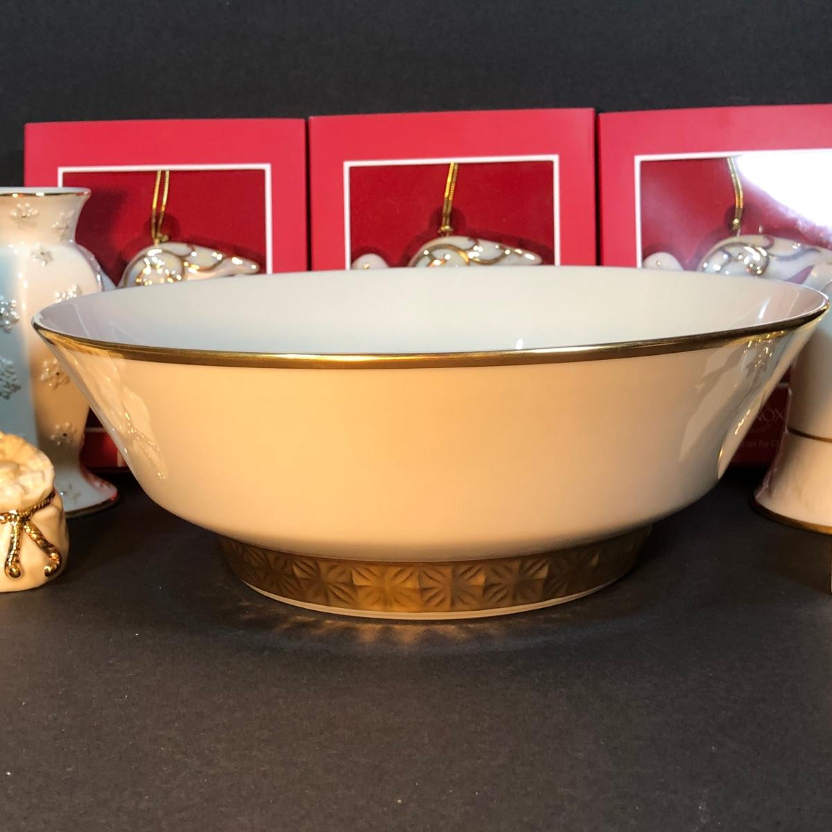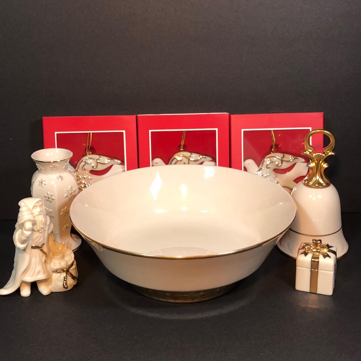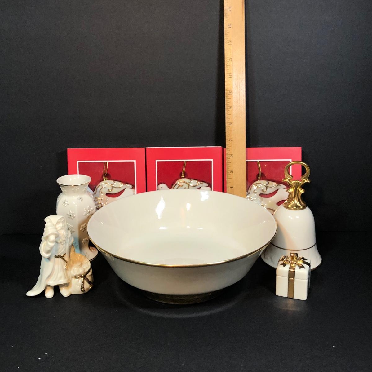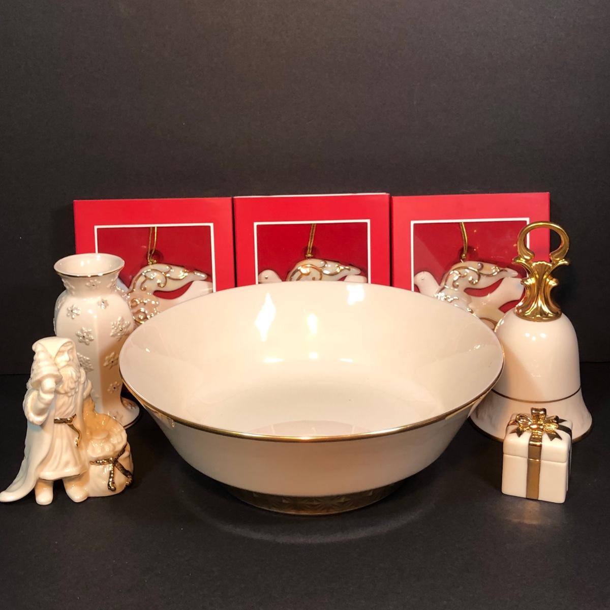 LOT 35M: Lenox Collection - 10" Bowl, Ornaments, Trinket Box, Bell, Figurine & Vase