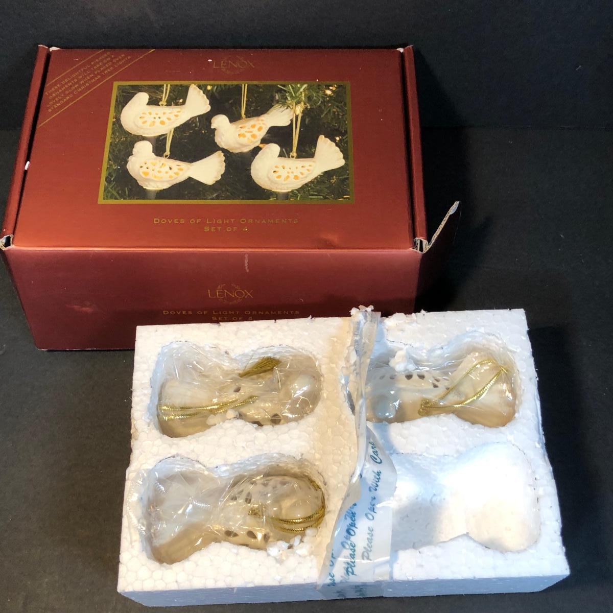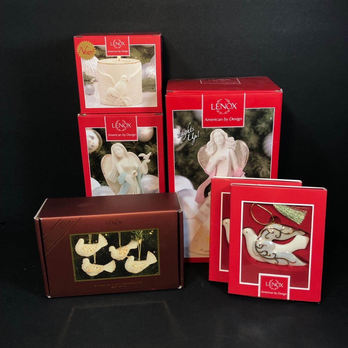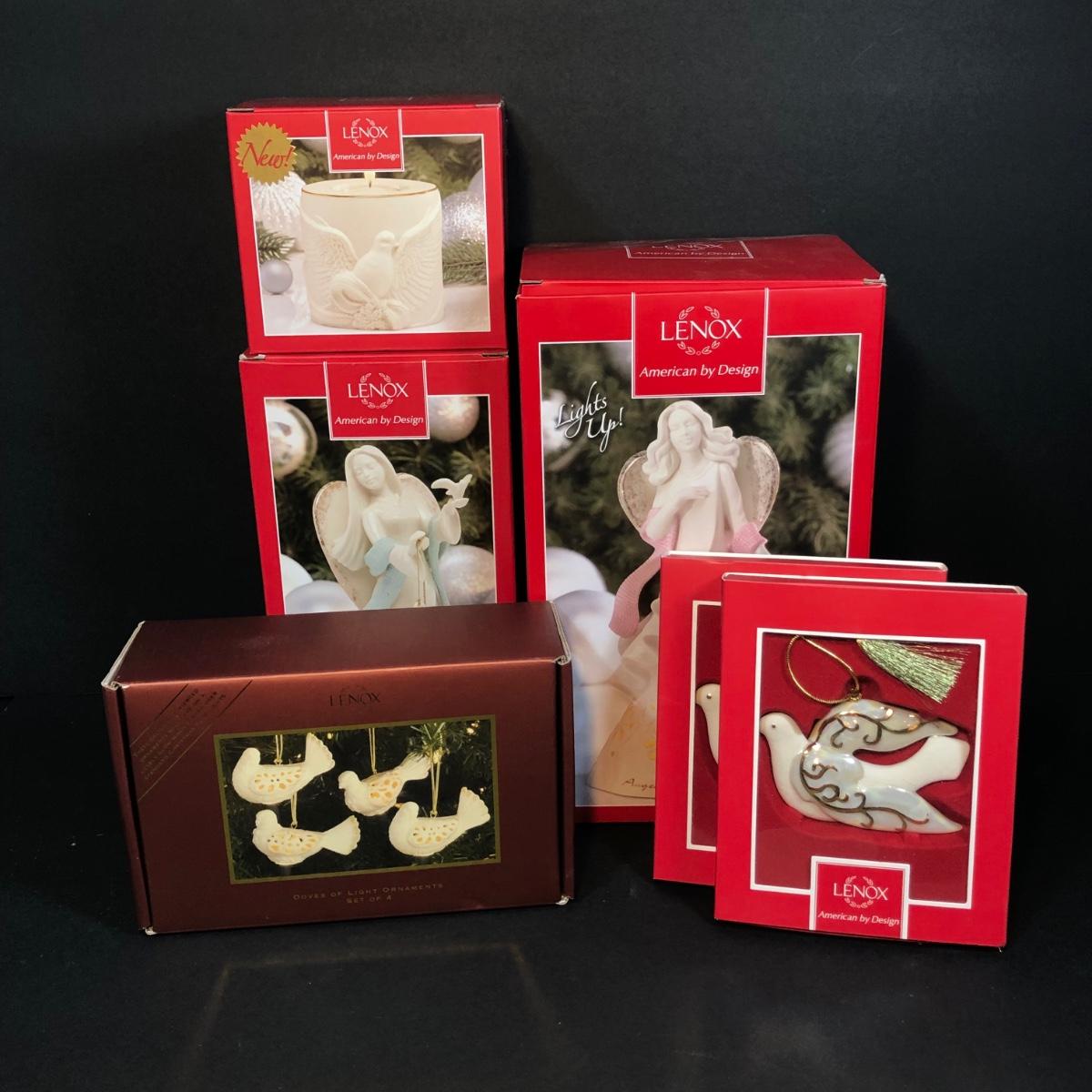 LOT 40M: Lenox Christmas in Boxes - Gifts of Grace Angels, Radiant Light Dove Votive, Doves of Light Ornaments (3 only) & Golden Scroll Dove Ornaments