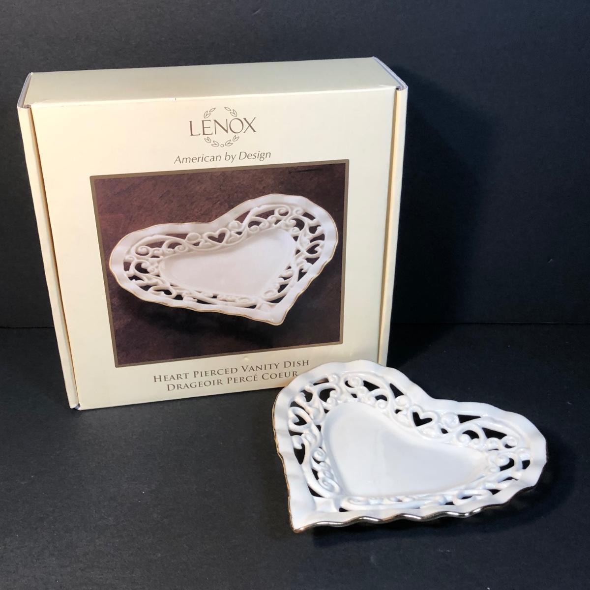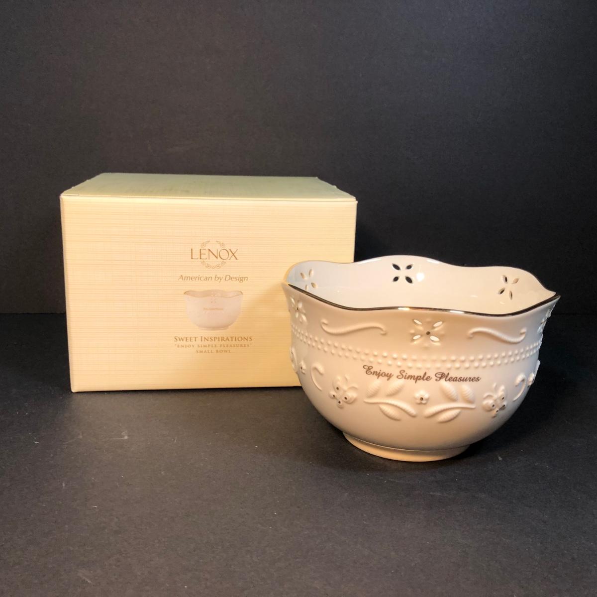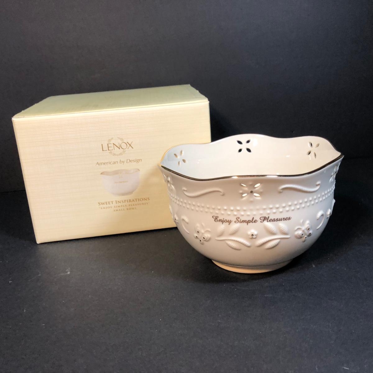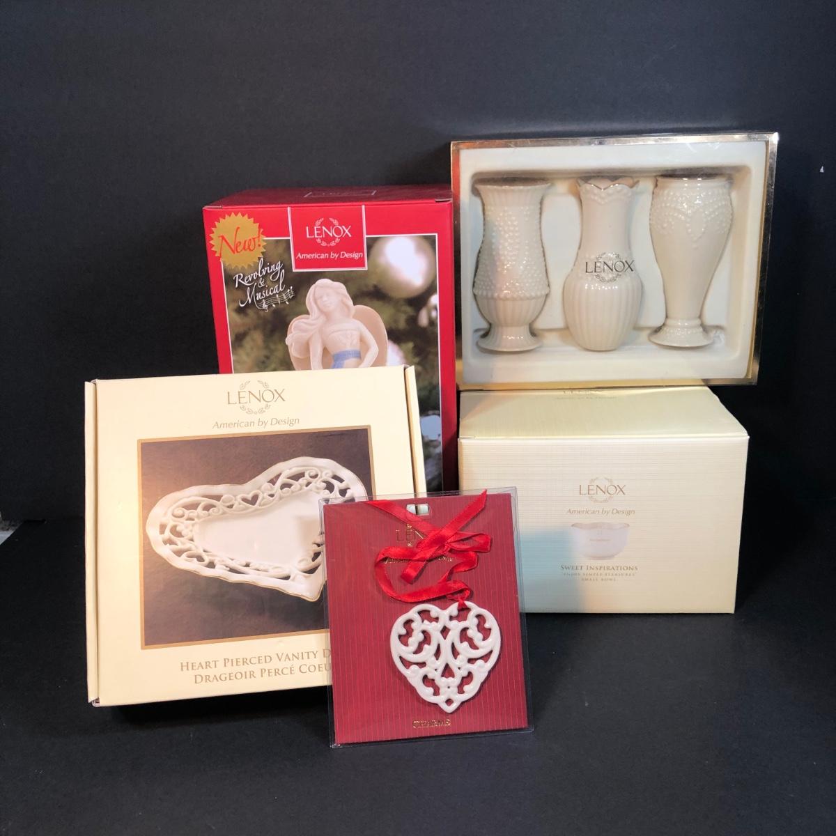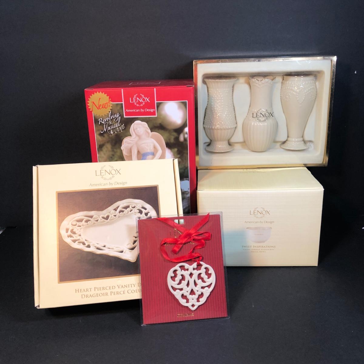 LOT 41M: Lenox in Package - Pierced Heart charm, Set of 3 Beaded Vases, Heart Pierced Vanity Dish, Sweet Inspirations "Enjoy Simple Pleasures" Small Bowl & Gifts of Grace Musical Angel Figurine