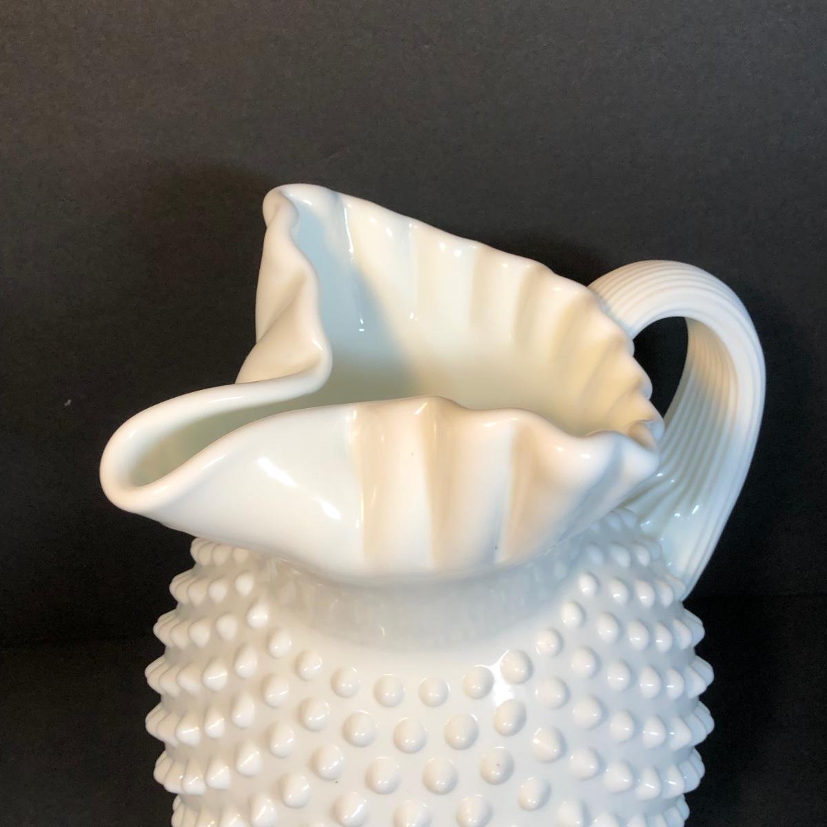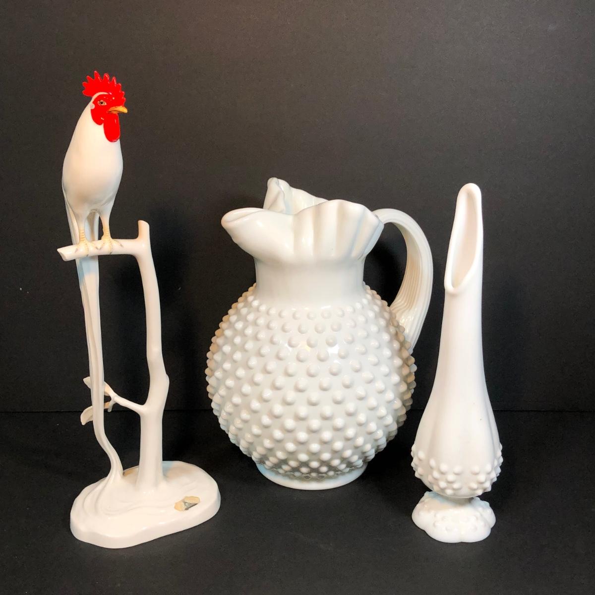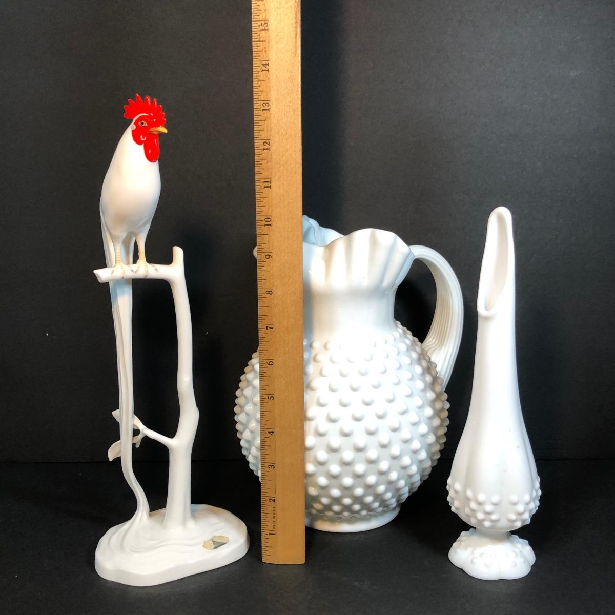 LOT 53M: Noritake Perched Rooster Sculpture, Fenton Vase & Milk Glass Pitcher